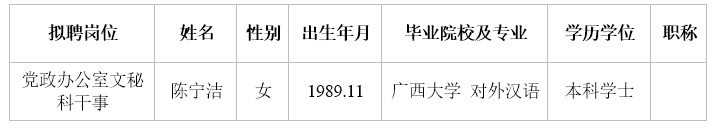 根据《关于印发< 广西壮族自治区事业单位公开招聘人员实施办法>的通知》(桂人社发[2011]155号)及《广西银行学校2018年冬季公开招聘非实名制人员公告》的有关规定,通过报名、资格审查、考试、考核、体检等程序,经研究决定,拟聘陈宁洁同志为taptap点点工作人员。现将拟聘用人员名单予以公示,公示时间为2019年2月9日-2019年2月19日,如有异议,请于2月19日下午5:00前以书面形式并署真实姓名反馈到学校纪委或组织人事处。联系地址:广西南宁市大学东路91号,邮政编码:530007,联系电话:0771—3240084,0771—3278961。