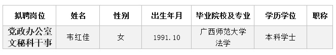 根据《关于印发<广西壮族自治区事业单位公开招聘人员实施办法>的通知》(桂人社发[2011]155号)及《广西银行学校2018年冬季公开招聘非实名制人员公告》的有关规定,通过报名、资格审查、考试、考核、体检等程序,经研究决定,拟聘韦红佳同志为taptap点点工作人员。现将拟聘用人员名单予以公示,公示时间为2019年3月4日-2019年3月12日,如有异议,请于3月12日下午5:00前以书面形式并署真实姓名反馈到学校纪委或组织人事处。联系地址:广西南宁市大学东路91号,邮政编码:530007,联系电话:0771—3240084,0771—3278961。