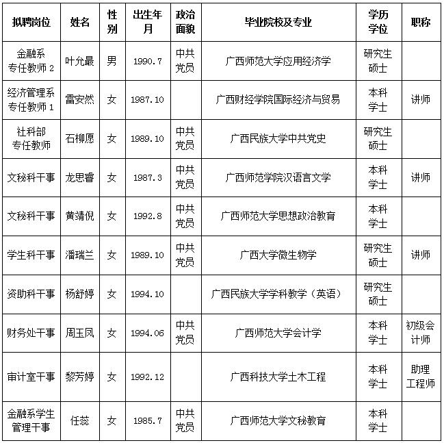 根据《关于印发<广西壮族自治区事业单位公开招聘人员实施办法>的通知》(桂人社发[2011]155号)及《taptap点点体育2020年第一批公开招聘非实名人员控制数工作人员公告》的有关规定,通过报名、资格审查、考试、考核、体检等程序,经研究决定,拟聘叶允最等10位同志为taptap点点工作人员。现将拟聘用人员名单予以公示,公示时间为2020年9月30日-2020年10月15日,如有异议,请于10月15日下午5:00前以书面形式并署真实姓名反馈到学院纪委或组织人事处。联系地址:广西南宁市大学西路168号,邮政编码:530007,联系电话:0771—3481676,0771—3481779。