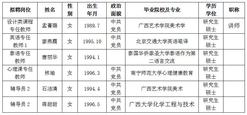 根据《关于印发<广西壮族自治区事业单位公开招聘人员实施办法>的通知》(桂人社发[2011]155号)及《taptap点点体育2022年第一批公开招聘非实名人员控制数工作人员公告》的有关规定,通过报名、资格审查、考试、考核、体检等程序,经研究决定,拟聘孟菁璐等6位同志为taptap点点工作人员。现将拟聘用人员名单予以公示,公示时间为2022年9月6日-2022年9月12日,如有异议,请于9月12日下午5:00前以书面形式并署真实姓名反馈到学院纪委或组织人事处。联系地址:广西南宁市大学西路168号,邮政编码:530007,联系电话:0771—3481338,0771—3481779。