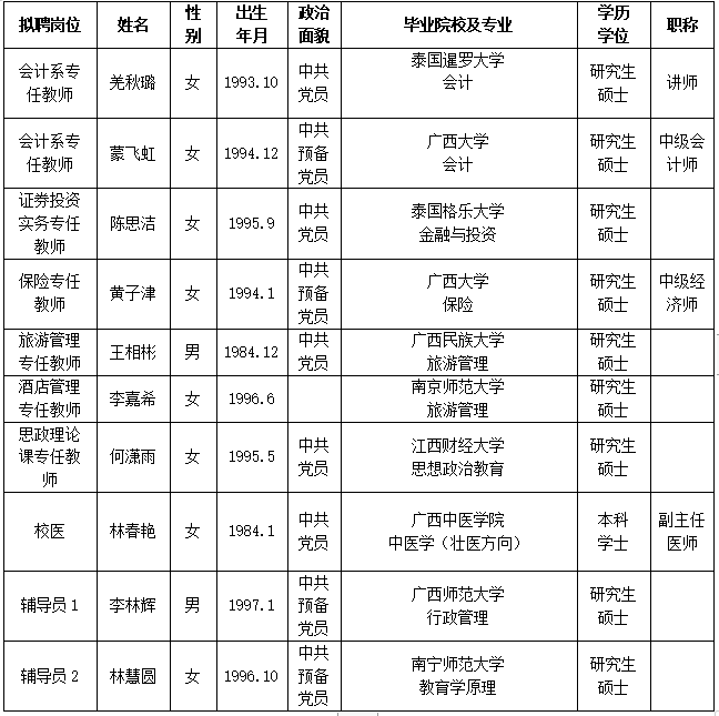 根据《关于印发<广西壮族自治区事业单位公开招聘人员实施办法>的通知》(桂人社发[2011]155号)及《taptap点点体育2023年第一批公开招聘非实名人员控制数工作人员公告》的有关规定,通过报名、资格审查、考试、考核、体检等程序,经研究决定,拟聘羌秋璐等10位同志为taptap点点工作人员。现将拟聘用人员名单予以公示,公示时间为2023年5月17日-2023年5月23日,如有异议,请于5月23日下午5:00前以书面形式并署真实姓名反馈到学院纪委或组织人事处。联系地址:广西南宁市大学西路168号,邮政编码:530007,联系电话:0771—3481338,0771—3481779。