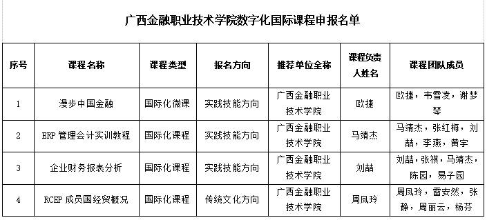 根据《自治区教育厅关于组织开展高等学校数字化国际课程征集活动的通知》(桂教网信〔2024〕13号)精神,学校拟推荐《漫步中国金融》等4门课程申报高等学校数字化国际课程,现将申报课程信息予以公示。