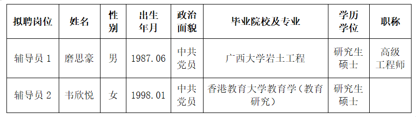 根据《关于印发<广西壮族自治区事业单位公开招聘人员实施办法>的通知》(桂人社发〔2011〕155号)及《taptap点点体育2024年第一批公开招聘非实名人员控制数工作人员公告》的有关规定,通过报名、资格审查、考试、考核、体检等程序,经研究决定,拟聘磨思豪、韦欣悦同志为我校工作人员。现将拟聘用人员名单予以公示,公示时间为2024年8月27日-2024年9月2日,如有异议,请于2024年9月2日下午5:00前以书面形式并署真实姓名反馈到学校纪委或人事处。联系地址:广西南宁市大学西路168号,邮政编码:530007,联系电话:0771—3481338,0771—3481779。