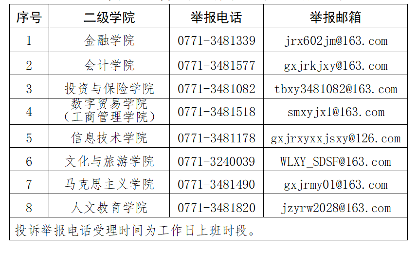 学校师德师风监督举报电话:0771-3481675;举报邮箱jrxyjsgzb@163.com。投诉举报请提供具体线索材料。