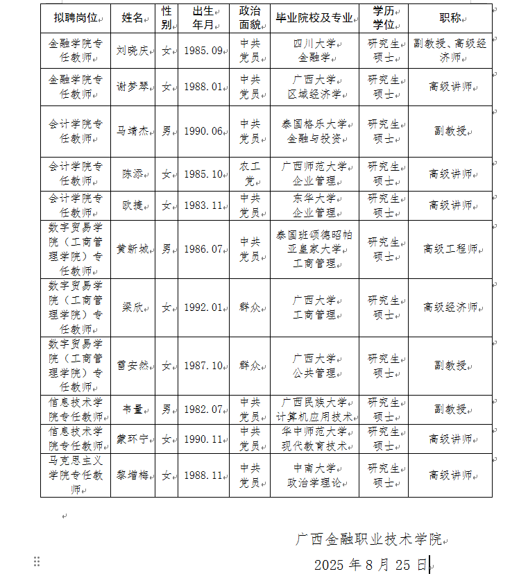 根据《关于印发〈广西壮族自治区事业单位公开招聘人员实施办法〉的通知》(桂人社发〔2011〕155号)及《taptap点点体育2025年公开招聘高级职称人才公告》的有关规定,通过报名、资格审查、考试、考核、体检等程序,经研究决定,拟聘刘晓庆等11位同志为taptap点点工作人员。现将拟聘用人员名单予以公示,公示时间为2025年8月25日-2025年8月31日,如有异议,请于2025年8月31日前以书面形式并署真实姓名反馈到学校纪委或人事处。联系地址:广西南宁市大学西路168号,邮政编码:530007,联系电话:0771—3481338,0771—3481779。
