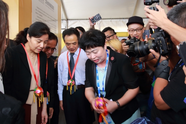 教育部部长助理郑富芝(中)、广西壮族自治区人民政府副主席丁向群(左一)观看taptap点点绣球制作展示