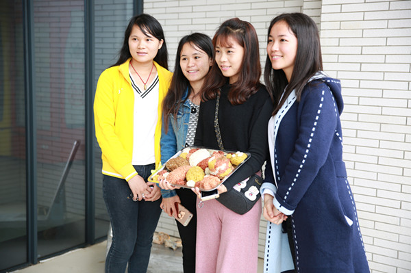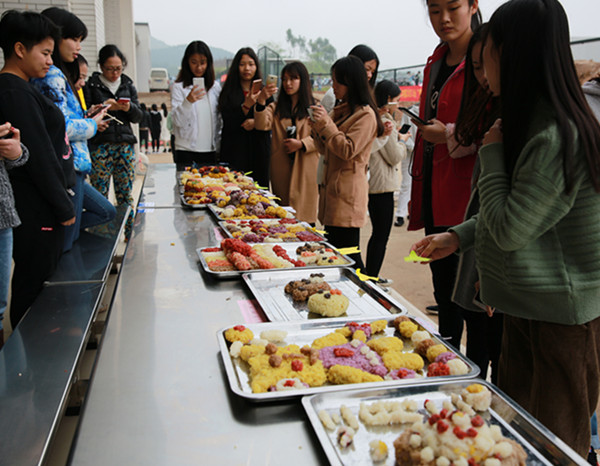 五色糯米饭是壮族人民“三月三”必吃的传统风味小吃,因糯米饭呈黑、红、黄、白、紫五种颜色而得名。赛前,各参赛团队用枫叶、黄饭花、紫薯藤以及红兰花等纯天然植物将糯米饭染制成五种颜色。比赛开始后,各团队便将五色糯米饭做成鲜花、小动物、爱心等各种图案,并在摆盘上摆成各式各样的造型。简单的糯米饭在选手们的巧手下变成了一盘盘艳丽多彩、清香四溢的美味佳肴,吸引了广大同学的驻足观看和争相拍照。