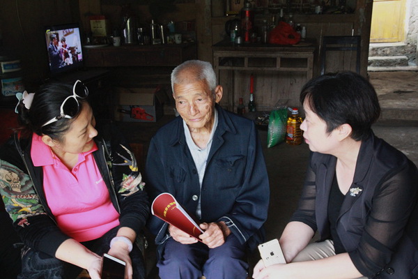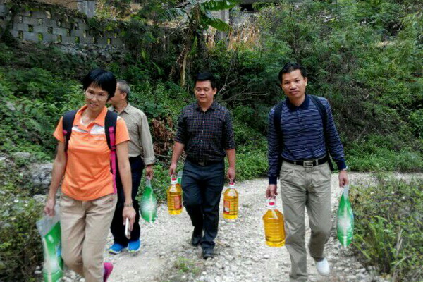 各小分队驱车深入村屯,爬山越岭,到贫困户家中发放米、食用油和慰问金,与群众促膝座谈,了解群众的难处;对家里有上学的儿童、青少年,给予高度的人文关怀,了解学习情况、政策享受情况,鼓励他们用知识改变自己和家庭的命运;对有山上落石威胁房屋的村民,做好安全宣传和救灾的相关知识普及工作。