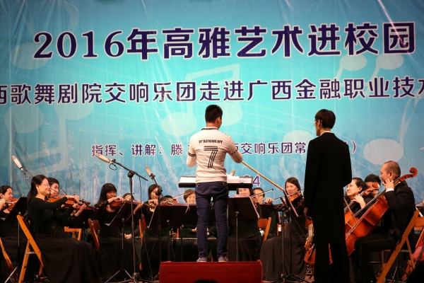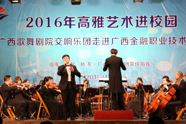 为了丰富同学们的课余生活,使同学们能够近距离的接触高雅艺术,11月24日晚,taptap点点有幸邀请到了广西歌舞剧院交响乐团到学校进行演奏。学院党委副书记、纪委书记刘华政,副院长谢沛善,学生工作与招生就业处副处长周海峰与六百余名金院学子在东校区大礼堂聆听了由广西歌舞剧院交响乐团带来的音乐盛宴。