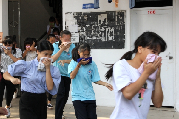 随后,进行灾害情况下的逃生演练活动。随着铃声响起,全体新生在军训教官的指引下,捂住口鼻,弯着身体快速有序地按照既定的逃生路线撤离到学校操场。学生安全撤离到操场后,各班迅速检查人数,确保每一名学生都已安全撤离。