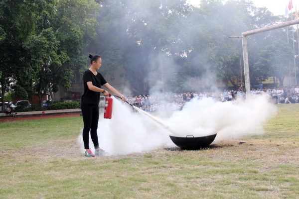 逃生演练结束后,大队官兵对疏散演练活动给予点评,并就初期火灾的应对措施进行讲解,并进行灭火器使用演示。随后,组织全体新生开展实地消防灭火演练,由军训教官在每班抽出一名学生出列,分多批使用灭火器进行灭火的操作训练。同学们一次次成功地将“大火”扑灭,得到在场师生的热烈掌声。