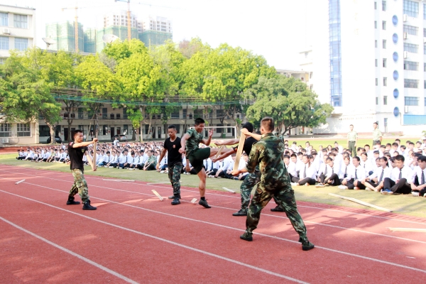 会操表演在神圣、庄严的升旗仪式中拉开了序幕。同学们个个英姿飒爽、气势昂扬,等待迎接学校领导和老师的检阅。沈立君校长检阅了各新生方阵。随后,入场分列式表演开始。全体同学步伐坚定、口号洪亮,动作整齐划一,精神抖擞地迈着步伐,依次走过主席台接受检阅。紧接着由军训团教官进行拳术表演和硬气功表演。随着木条一次次在背上打断,木板一次次被踢断,教官们过硬的身体素质和精彩的表演让现场响起雷鸣般的掌声,同学们纷纷大呼过瘾。
