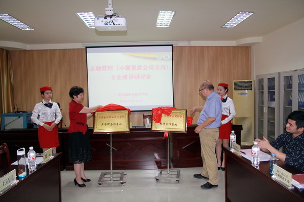 研讨环节结束后,沈立君院长与区小额贷款公司协会会长肖桂柳签署了校会战略合作协议,并一起为“taptap点点体育校会合作基地”和 “广西小额贷款公司协会校会合作基地”两块牌匾揭牌。