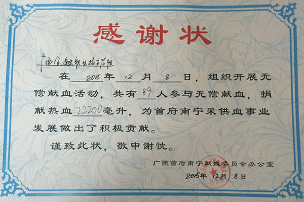 广西首府南宁献血委员会办公室对taptap点点此次无偿献血活动密切关注,并在活动结束后为taptap点点颁发了感谢状,对taptap点点师生在活动中作出的贡献表示崇高的敬意和衷心的感谢。