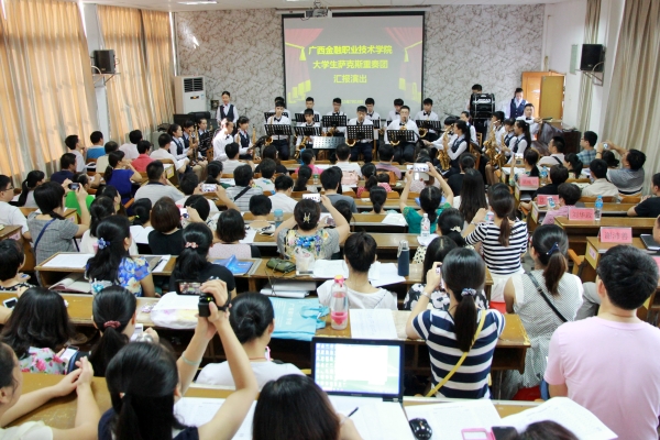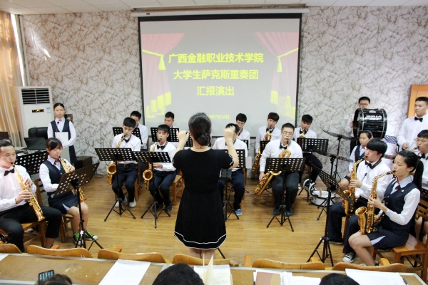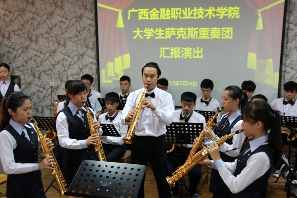 据悉,本乐团共分为高音部、中音部、次中音部和上低音部4个声部,由24名热爱音乐、崇尚音乐的学生组成,是广西第一支萨克斯重奏团。