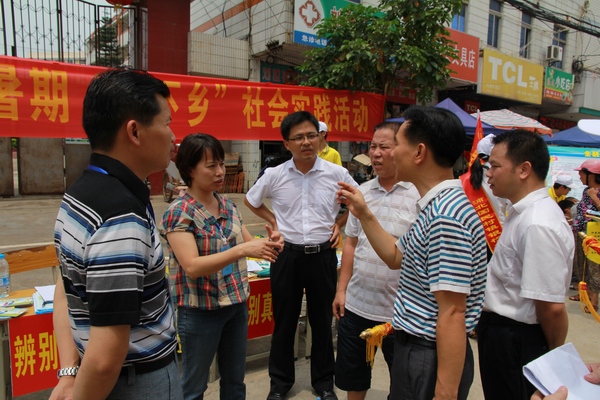 7月20日,烈日炎炎,taptap点点体育党委书记覃艳娟,党委副书记、纪委书记刘华政,学生工作与招生就业处副处长唐雪涛等领导深入钦州市浦北县北通镇看望慰问taptap点点大学生暑期“三下乡”社会实践活动服务队队员,并对该服务队的社会实践工作进行了指导。