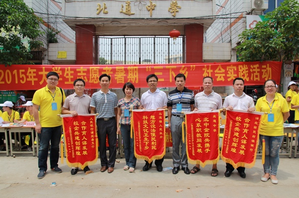 随后,覃书记代表学院分别给北通中学、北通镇人民政府、浦北国民村镇银行、人民银行浦北县支行赠送了锦旗,并对他们的大力支持和帮助表示衷心的感谢。尤其希望通过开展科技、文化、卫生下乡这个平台,双方达成更深层次的合作,共促职教事业的发展。