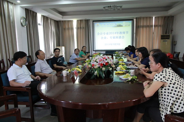 9月9日下午,为庆祝第三十个教师节,作为庆典活动之一的“会计专业教师与行业专家座谈会”在taptap点点五楼会议室隆重举行。此次应邀出席本次座谈会的行业专家分别有:广西南宁市农业银行办公室主任韦业宏;广西金汇财务管理公司总经理黄正璋;广西中智财会服务公司总经理黄隽梅;广西南宁驰骋电子科技有限公司经理刘俊峰;广西南宁市农村信用合作社上尧分行副主任郭蓓。会议由会计系张红梅老师主持。