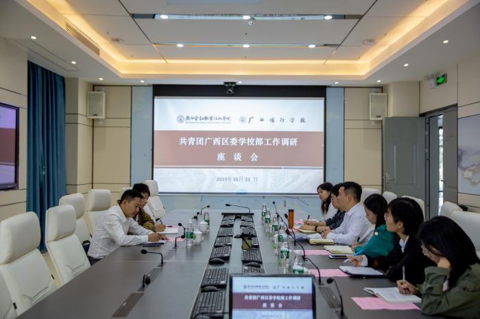 10月24日上午,共青团广西区委学校部部长钟声宇、副部长穆辉一行来taptap点点调研指导共青团工作并召开调研座谈会。taptap点点学生工作与招生就业处副处长、团委书记周海峰、团委副书记朱丽君及校团委老师、团总支负责人代表参加了调研座谈会。