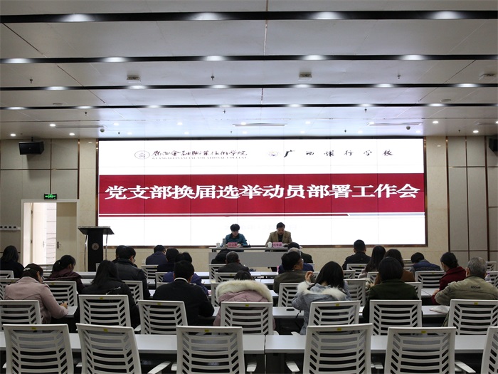 会上,沈立君书记传达了《关于印发<中共taptap点点体育(广西银行学校)委员会党支部换届选举工作方案>的通知》,就如何做好党支部换届选举工作从指导思想、组织领导、基本要求和原则、时间安排和主要程序以及内容等方面提出了实施意见。刘华政副书记宣读了《关于调整优化党支部设置的通知》。