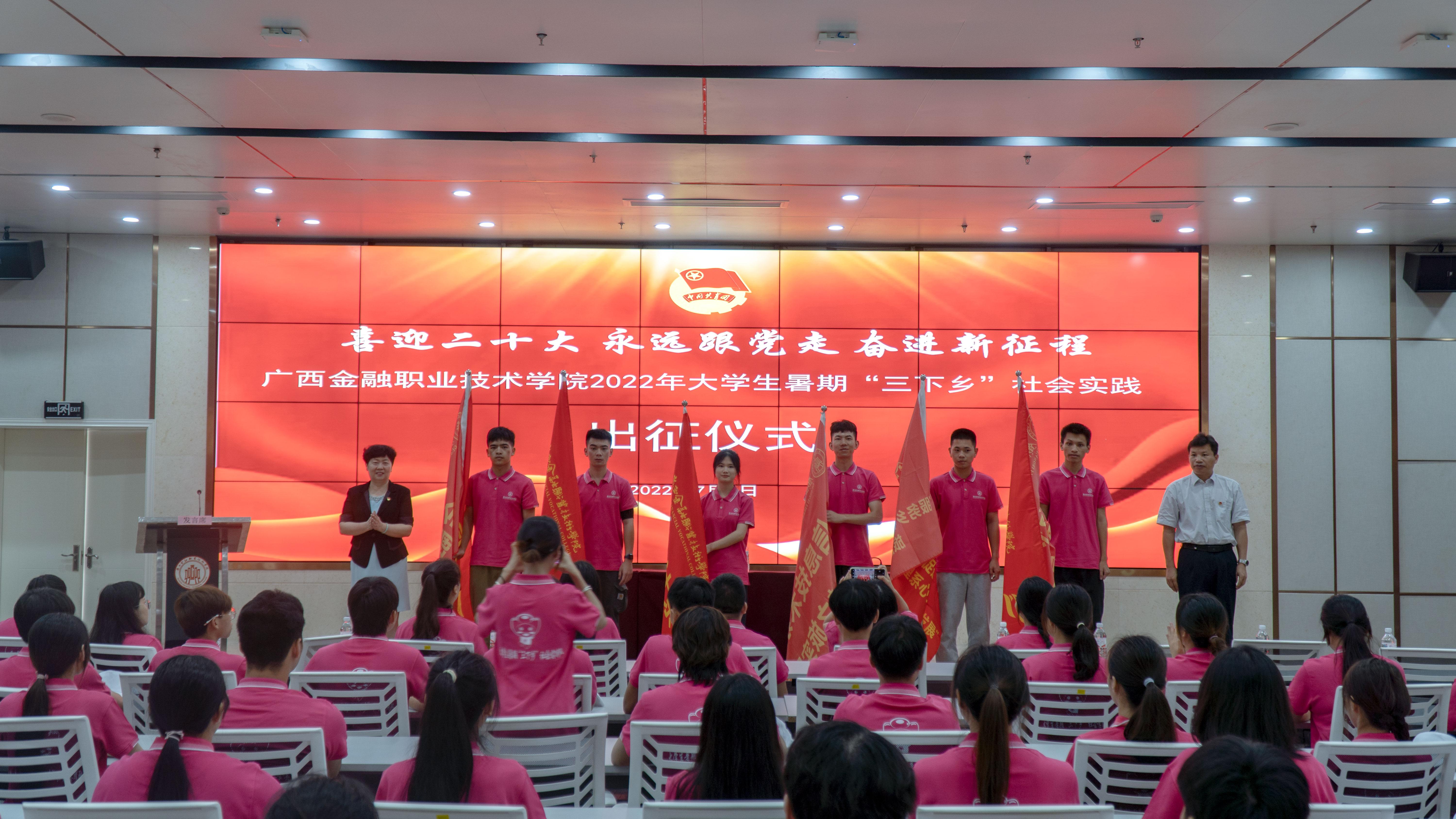 信息技术系“红色筑梦之旅”实践队指导教师孟菁璐和金融系“强国有我”实践队队员朱俊明同学作为发言。会计系国际财会2101班徐雪迎同学和社团实践团全体同学出征宣誓,纷纷承诺以奋发有为、敢于开拓的精神扎根八桂大地,在祖国最需要的地方贡献自己的青春力量。随后,沈立君书记和刘华政副书记为2022年暑期社会实践服务团代表授旗。