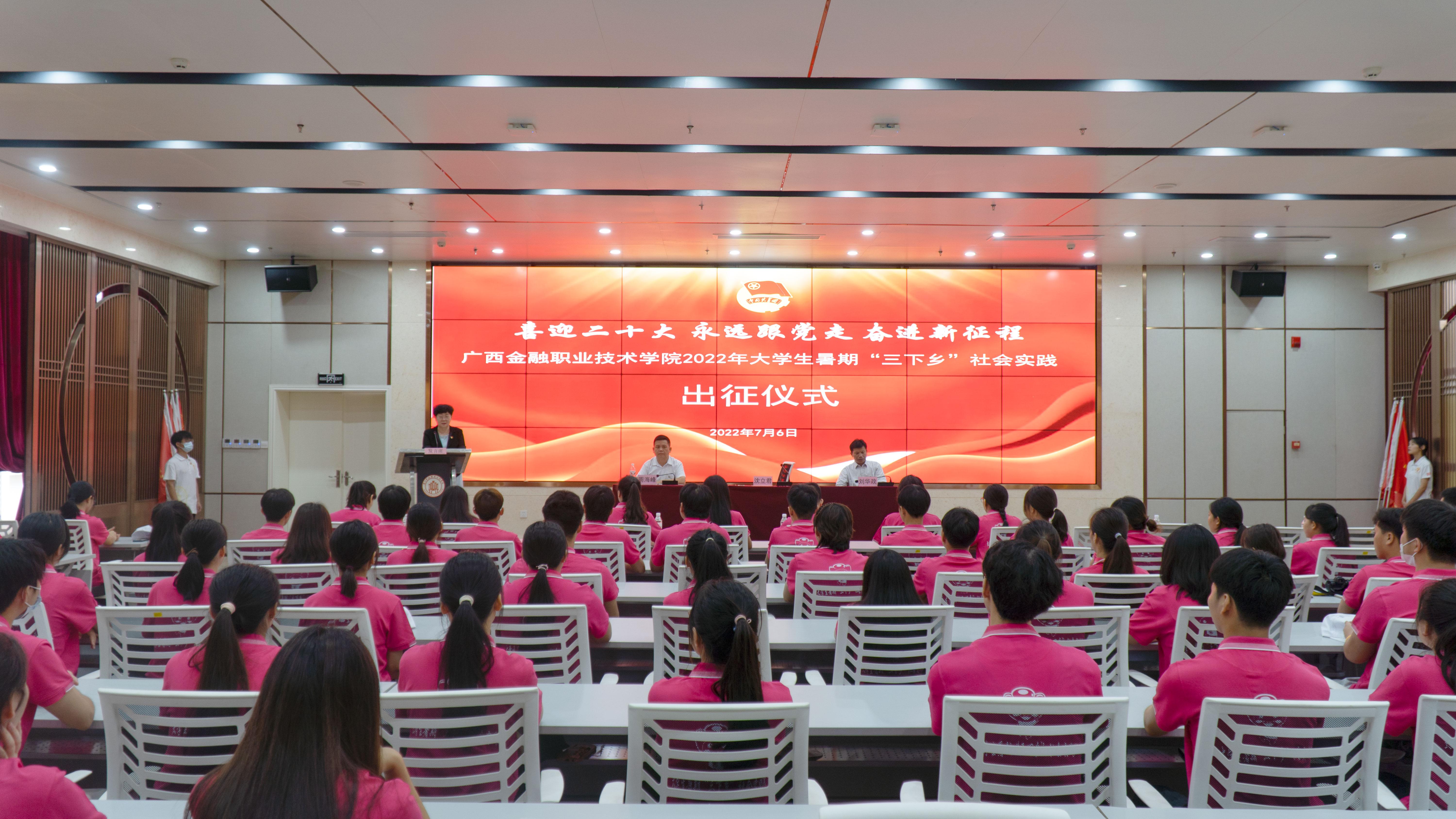 出征仪式上,沈立君书记代表学校向即将奔赴八桂各地参加社会实践的全体师生表示亲切的问候和良好的祝愿,向精心组织、周密部署本次活动的相关职能部门表示衷心感谢。沈立君书记强调,暑期“三下乡”社会实践活动是大家走出校门,下到基层,施展才干,服务人民的重要途径,并向同学们提出三点期许:一是在社会实践中凝聚精神力量,传承红色基因,坚定不移听党话、跟党走。二是在社会实践中锤炼能力,做到学以致用,为乡村振兴注入金院力量。三是在社会实践中严守纪律,树牢安全意识,确保实践活动平稳有序开展。