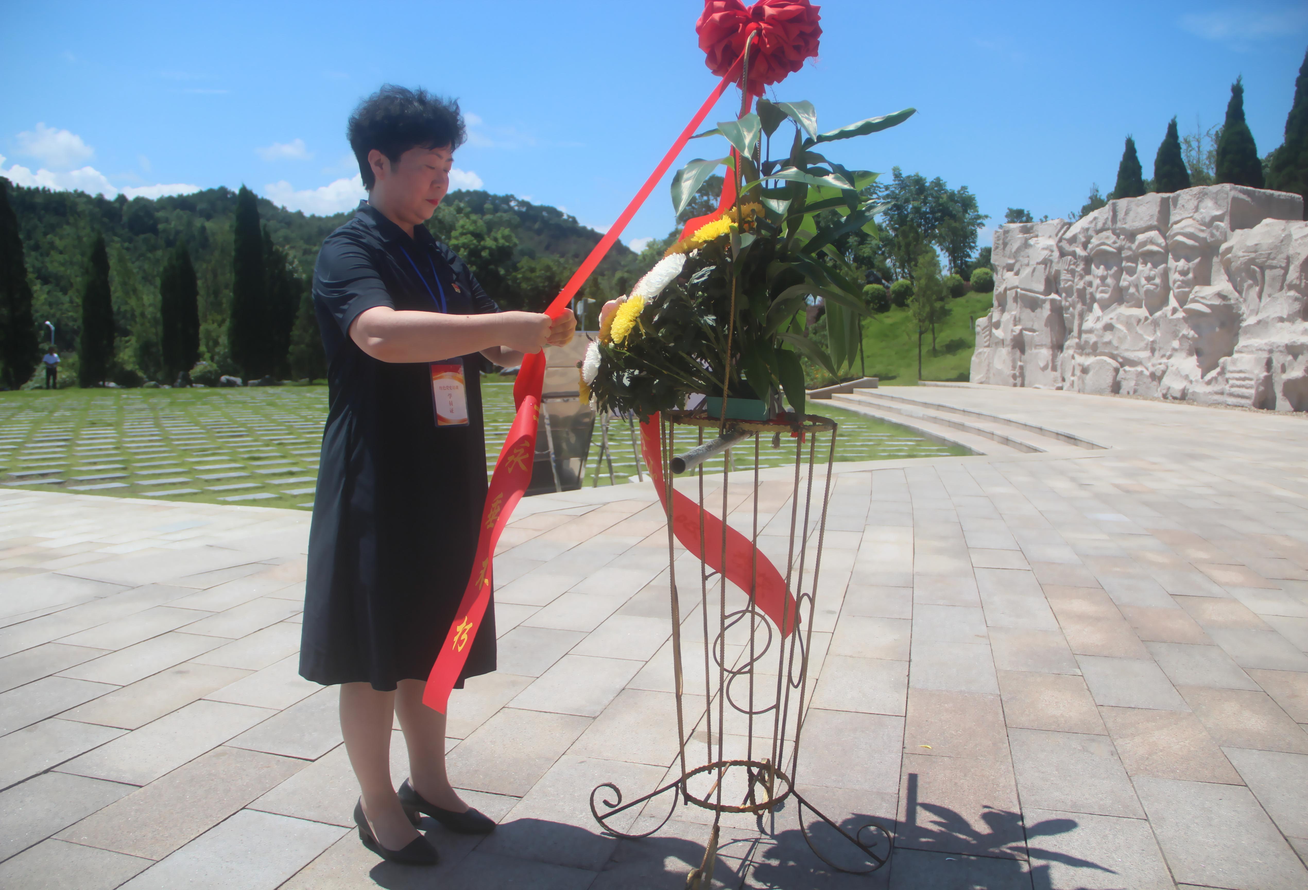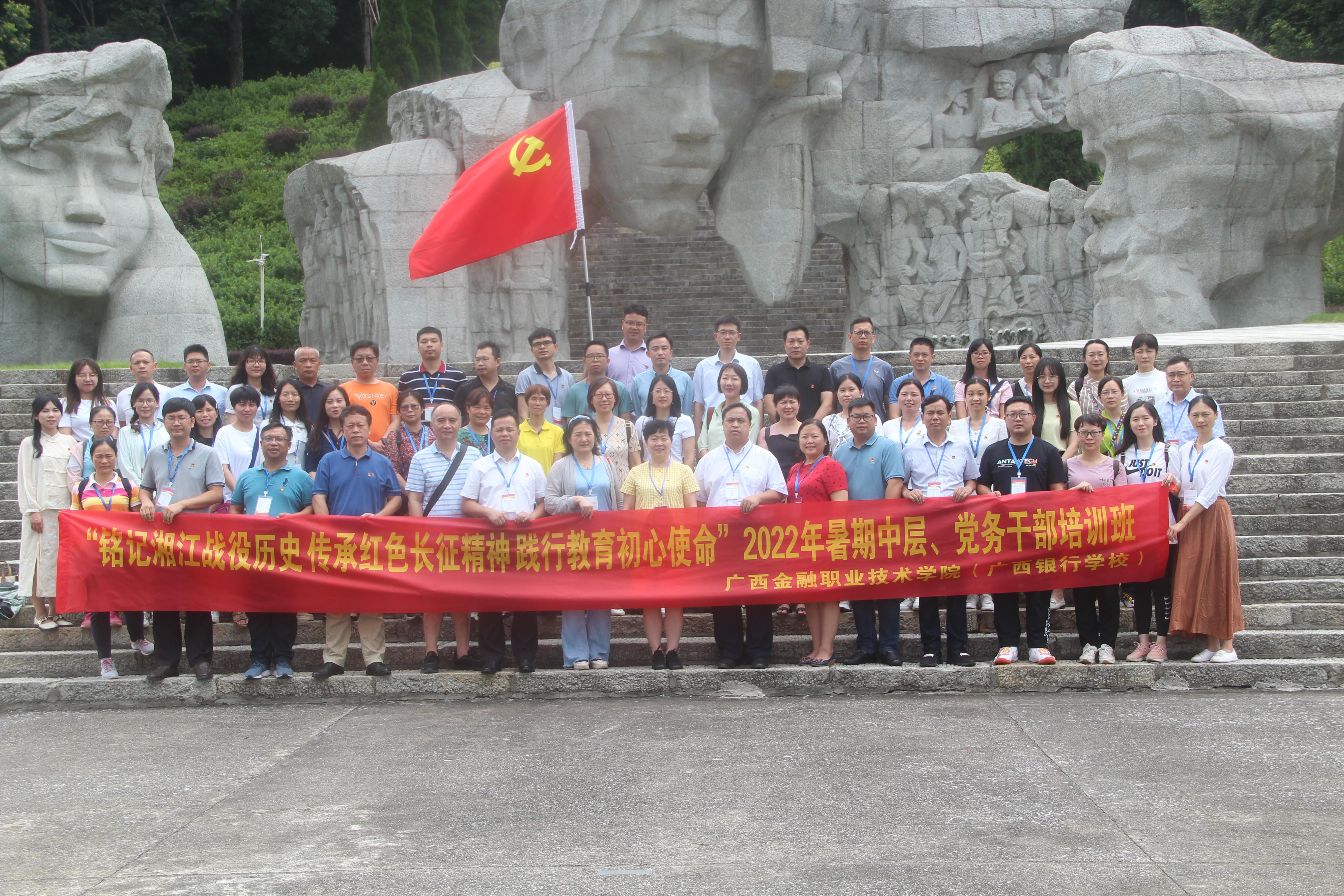 在红军长征湘江战役纪念馆凭吊广场前,全体学员列队肃立,举行了缅怀悼念仪式。大家向烈士忠魂敬献花圈,并面向烈士群雕默哀、三鞠躬。在鲜红的党旗前,党委书记沈立君带领大家重温了入党誓词,共同在铮铮誓言中坚定共产党员的初心和使命。