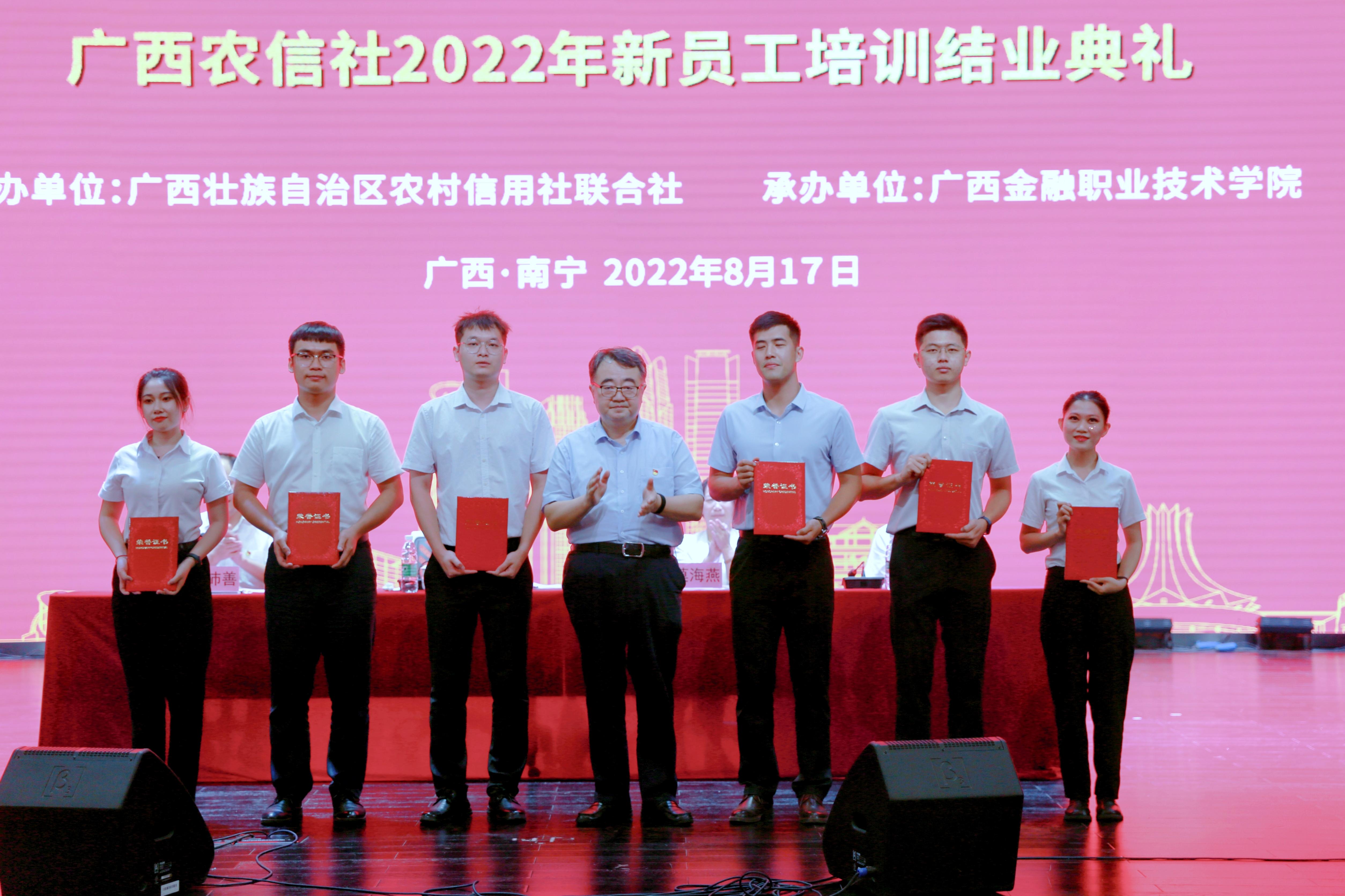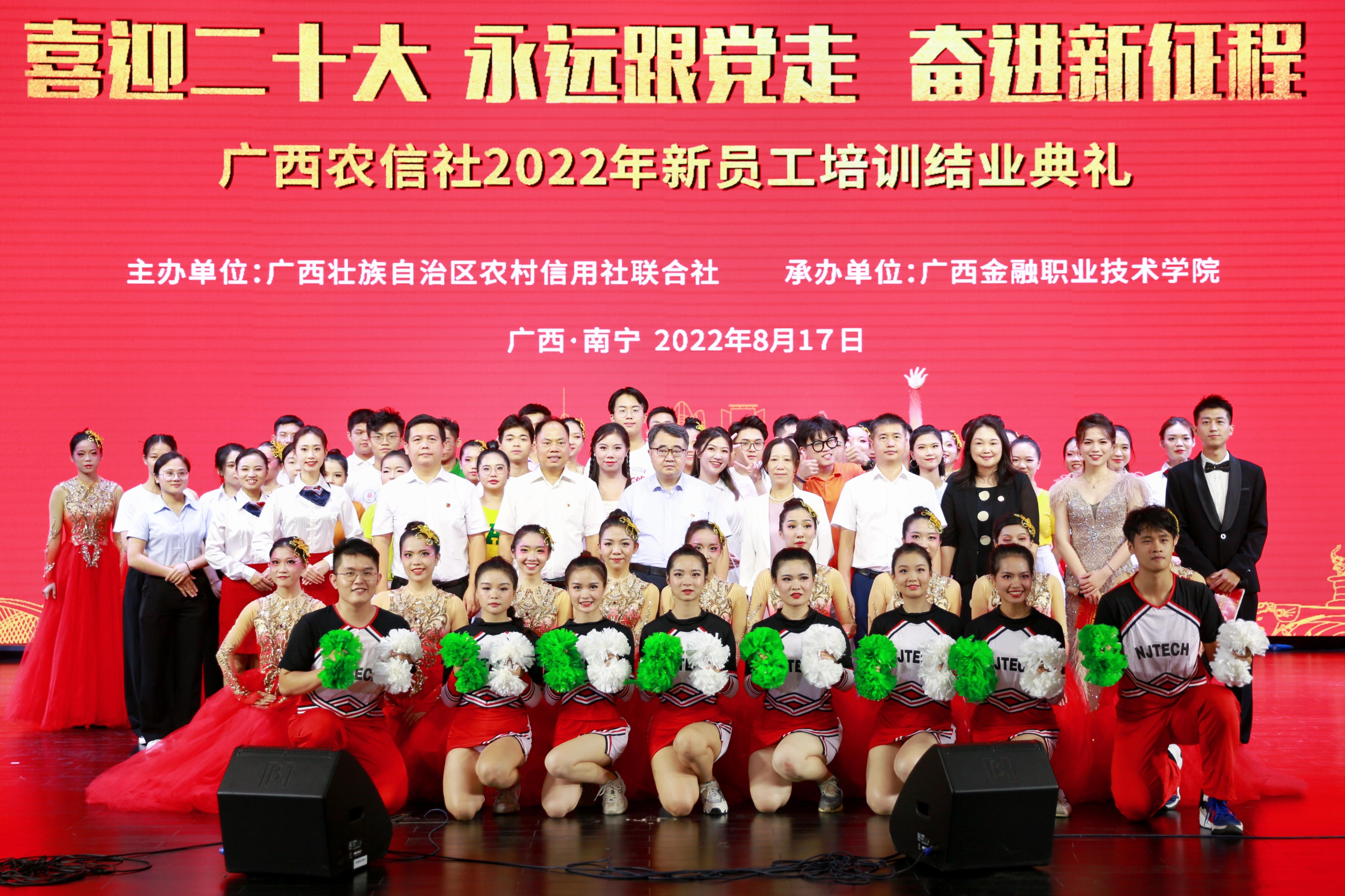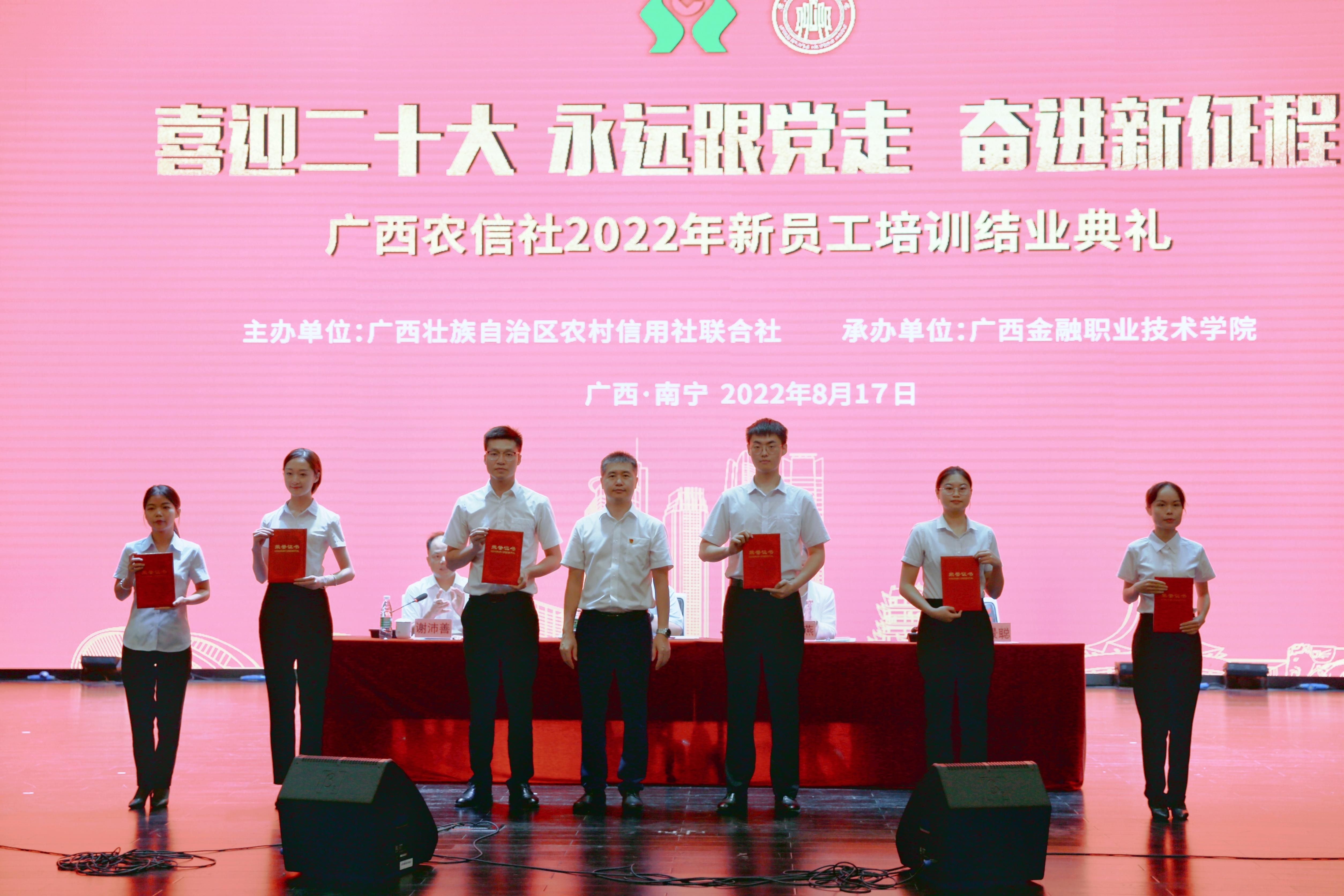 8月17日下午,“喜迎二十大 永远跟党走 奋进新征程”广西农信社2022年新员工培训结业典礼在taptap点点体育西校区国际会议中心举行。自治区农村信用联社党委书记、理事长罗军,党委组织部副部长、人力资源部副总经理钟景聪,taptap点点体育院长莫海燕、副院长谢沛善出席典礼。参加典礼的还有农信社、学校部分领导代表以及全体教官、班主任、培训学员。结业典礼由副院长谢沛善主持。