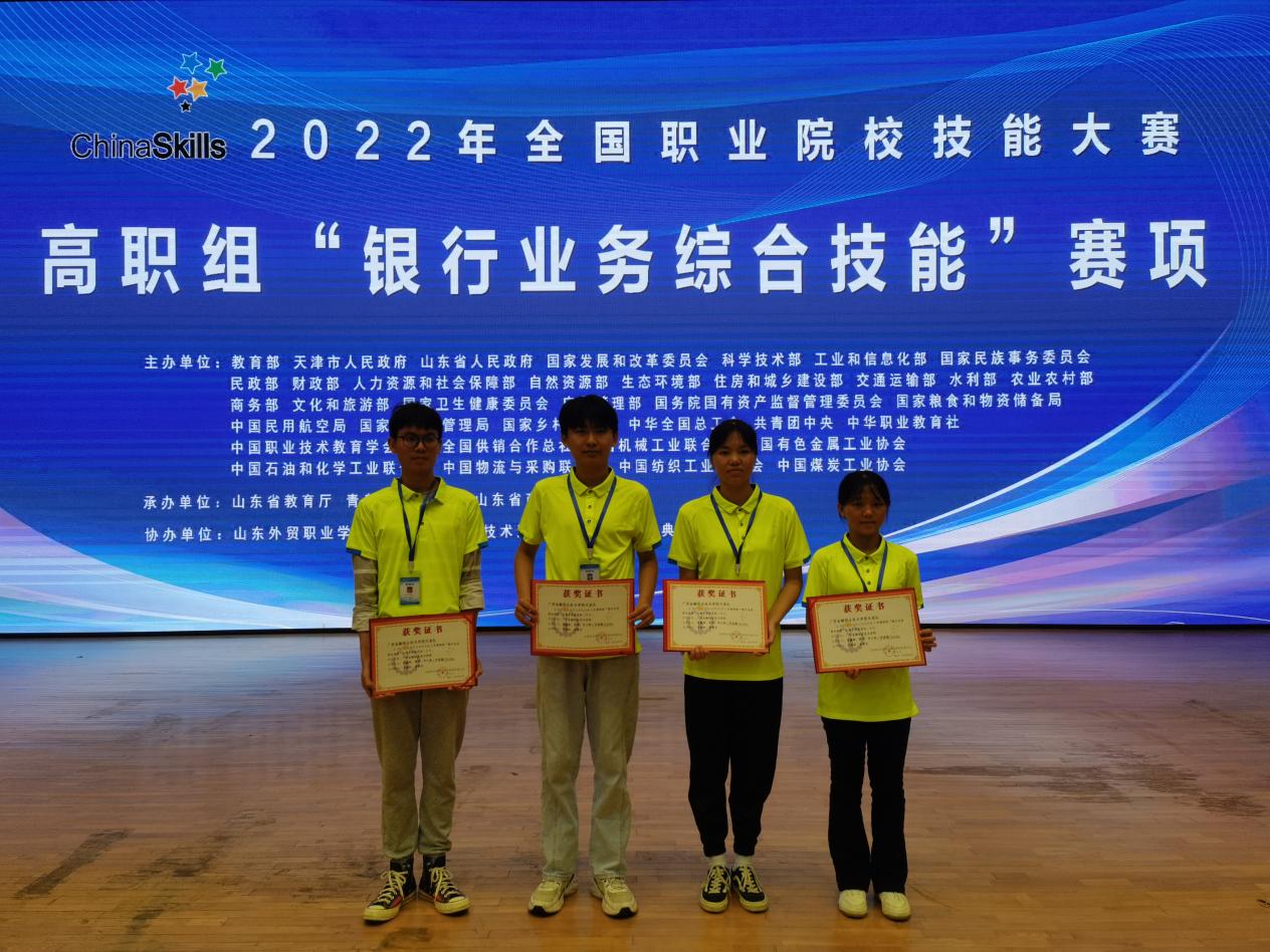 2022年全国职业院校技能大赛高职组“银行业务综合技能”赛项于8月14日—15日在山东省青岛市山东外贸职业学院举行。taptap点点金融系韦柳玲、唐雪花两位老师指导的4名参赛选手华文彪、李鑫辉、黄珂、卢成燕经过两天的激烈角逐,最终荣获全国团体三等奖。