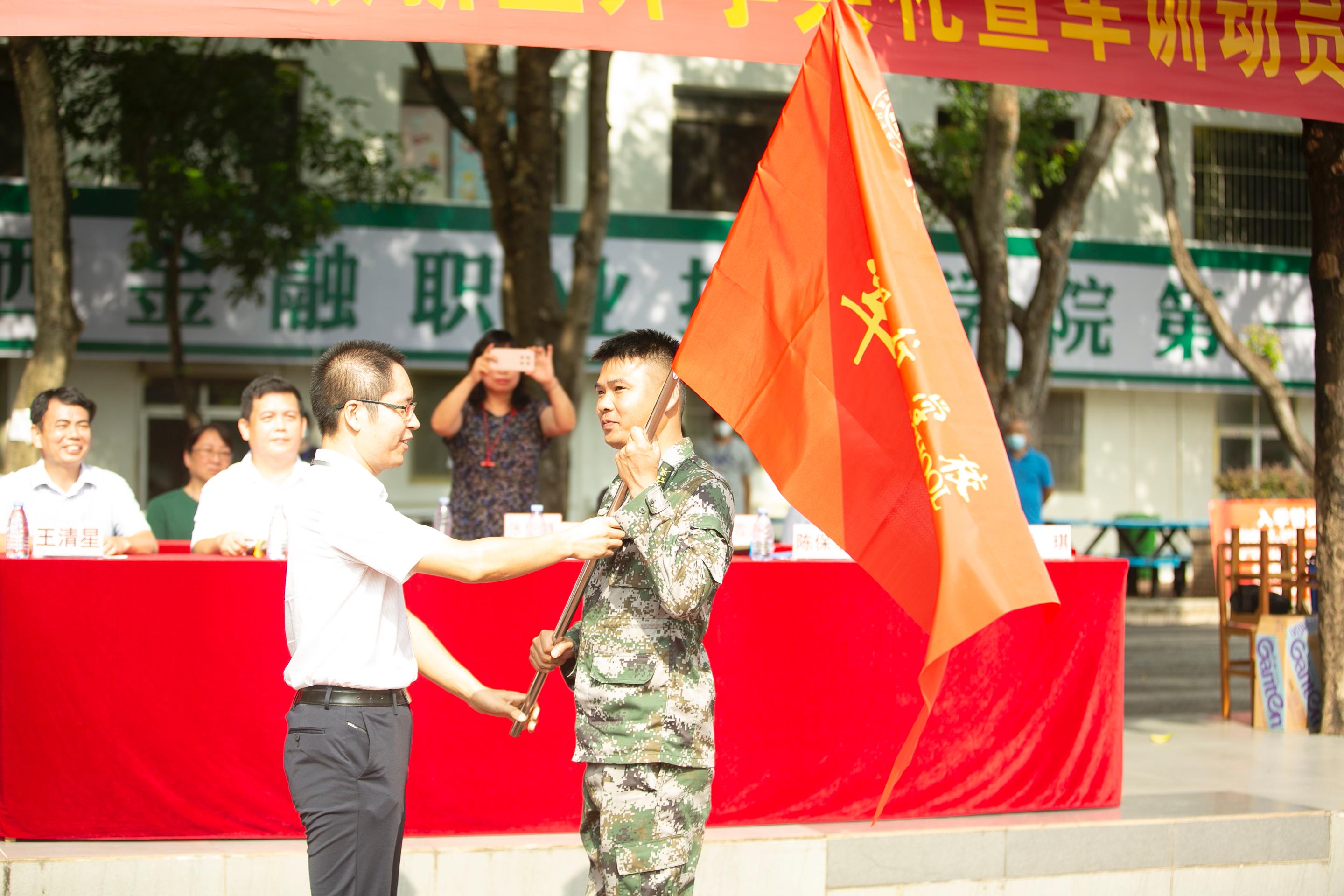 李高岩书记向承训单位授军训团团旗,鲜红的旗帜高高飞扬,标志着taptap点点2022级中职学生军训正式拉开帷幕。