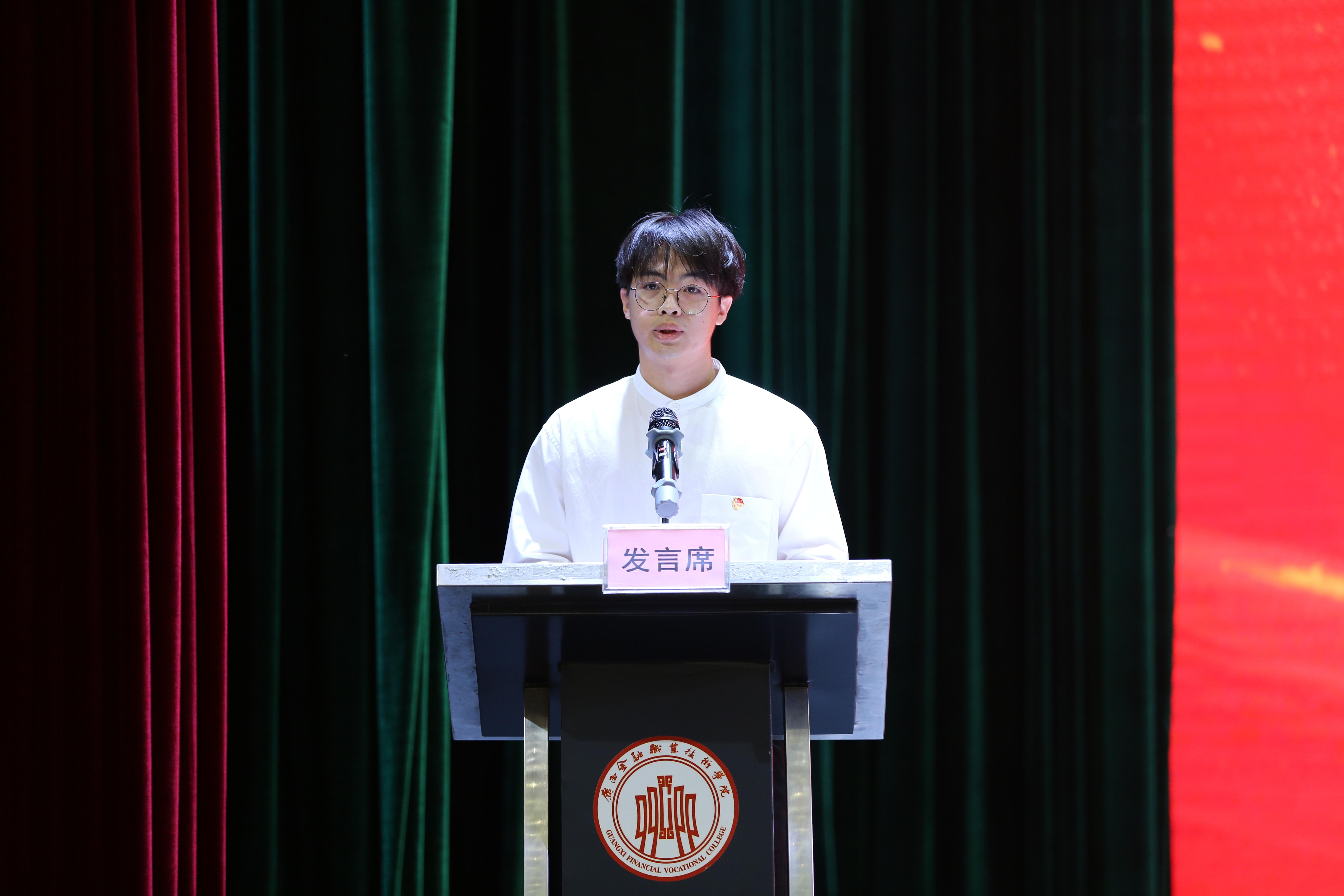 金融系金融与服务2105班陈长进同学作为老生代表发言,他结合自身在金院的经历,建议新同学们做一名认真求学的金院学子,找到自己热爱的事物,求学路上不畏艰难,关关难过关关过,前路漫漫亦灿灿!