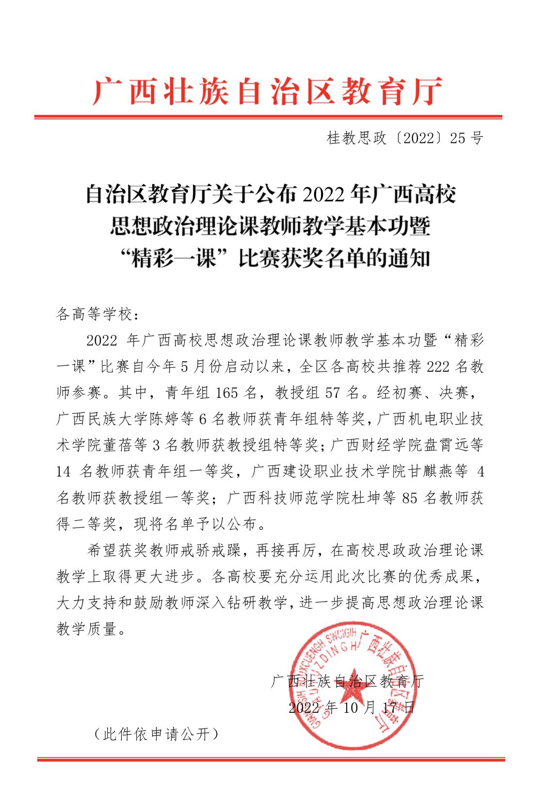 近日,自治区教育厅公布2022年广西高校思想政治理论课教师教学基本功暨“精彩一课”比赛获奖名单。taptap点点教师施茂荣荣获青年组一等奖。