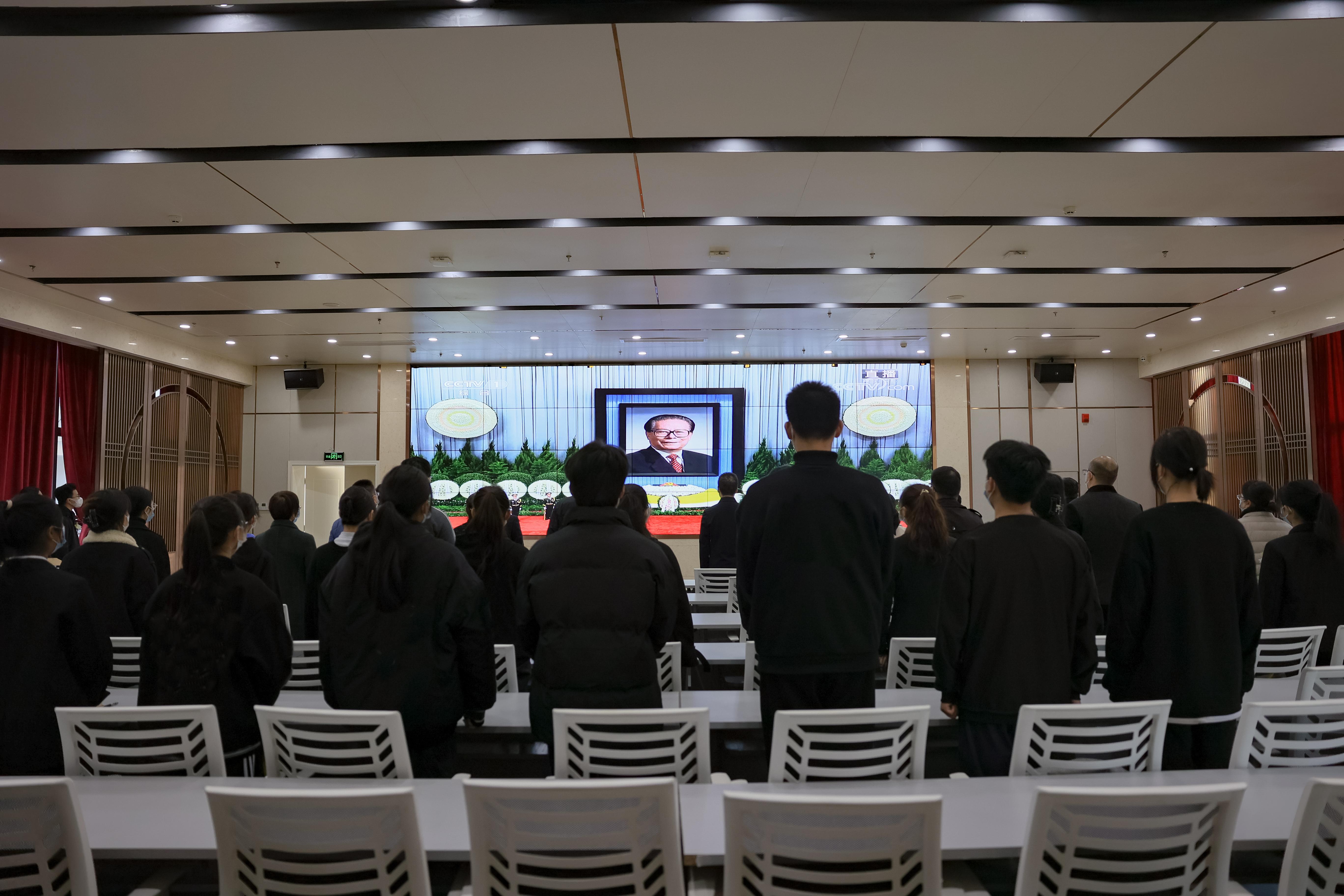 学校领导、各党支部书记、各部门主要负责人、师生代表在西校区道德大讲堂集中收听收看了的江泽民同志追悼大会现场直播。其余师生自行收听收看。哀乐响起,全体师生肃立,怀着悲痛的心情为江泽民同志默哀3分钟。沉痛悼念这位全党全军全国各族人民公认的享有崇高威望的卓越领导人,缅怀江泽民同志的光辉业绩,颂扬江泽民同志的伟大情操和崇高品质。