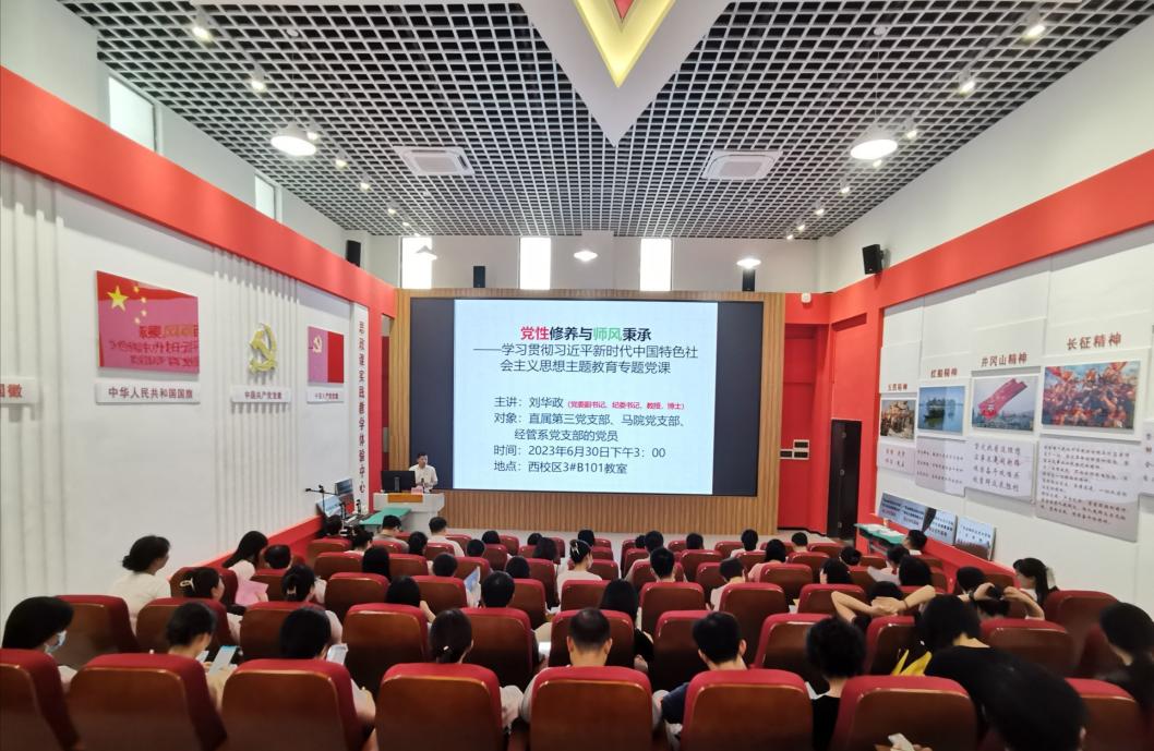 此次党课由学院党委副书记、纪委书记刘华政主讲,刘书记以《党性修养和师风秉承——学习贯彻习近平新时代中国特色社会主义思想主题教育》为主题,主要从导语、概念的界定、修养与秉承、时代的要求、结语五个方面,结合史实案例、时事热点,深入剖析党性修养与师风秉承的重要性,明确要求党员时刻铭记教书育人的使命,当好学生成长的引路人,以人格魅力引导学生心灵,传播知识、传播思想、传播真理,塑造灵魂、塑造生命、塑造新人,为培养德智体美劳全面发展的社会主义建设者和接班人、全面建设社会主义现代化国家作出自己应有的贡献。