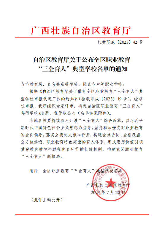 据悉,自治区职业教育“三全育人”典型学校评选根据《自治区教育厅关于做好全区职业教育“三全育人”典型学校申报认定工作的通知》(桂教职成〔2023〕19号),经学校申报、教育厅组织专家评审而最终确定,旨在以习近平新时代中国特色社会主义思想为指导,坚持和加强党对职业教育的全面领导,落实立德树人根本任务,推动构建全员协同、全程覆盖、全方位渗透、职业教育特色突出的育人体系,形成思想价值引领贯穿教育教学全过程和各环节的长效机制。