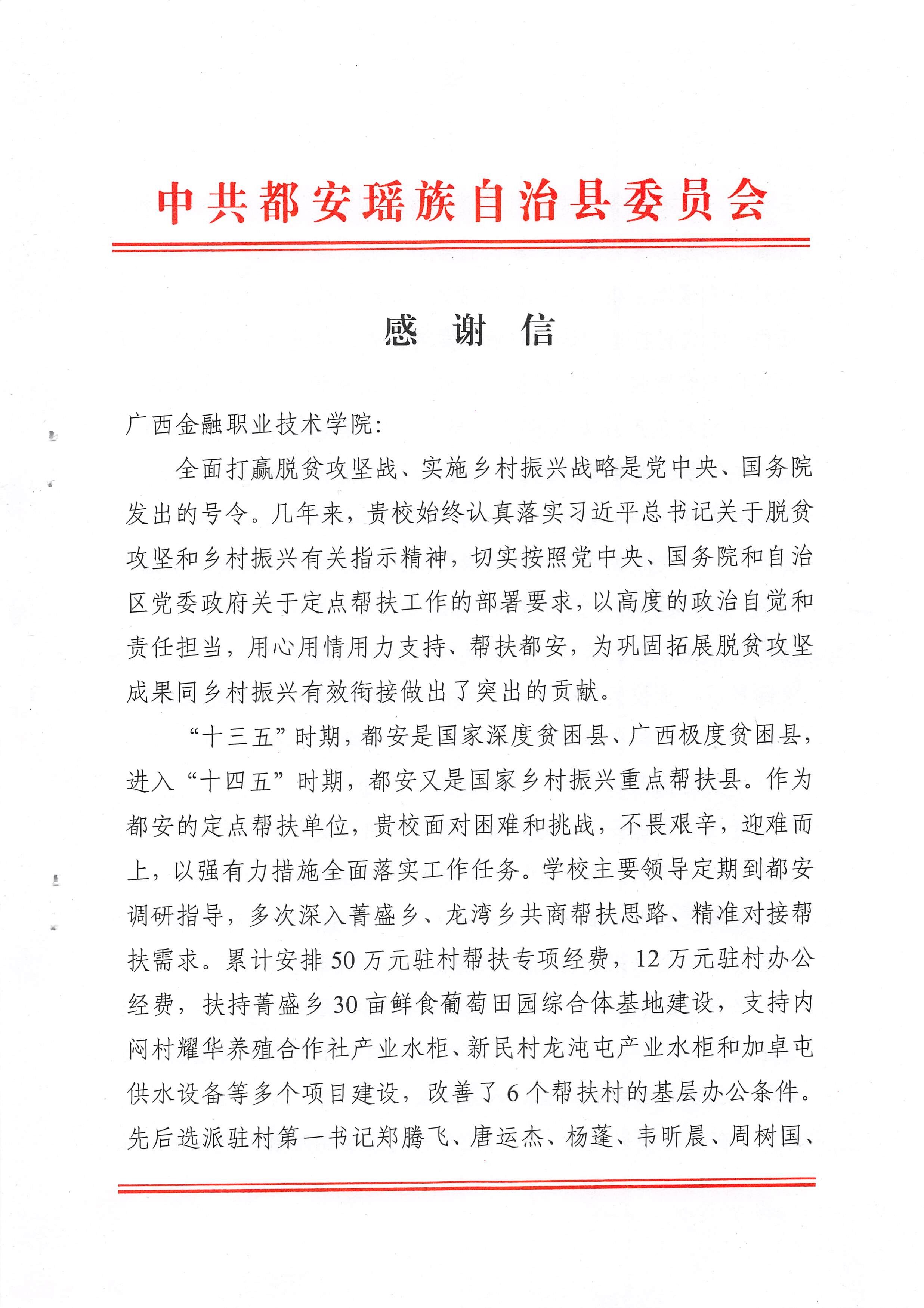 近日,中共都安瑶族自治县委员会向taptap点点发来《感谢信》,对taptap点点支持、帮扶都安,巩固拓展脱贫攻坚成果同乡村振兴有效衔接做出的突出贡献表示感谢,就taptap点点选派的驻村第一书记郑腾飞、唐运杰、杨蓬、韦昕晨、周树国、王建国、龙有胜等同志高标准高质量完成所承担的各项工作任务给予高度评价。
