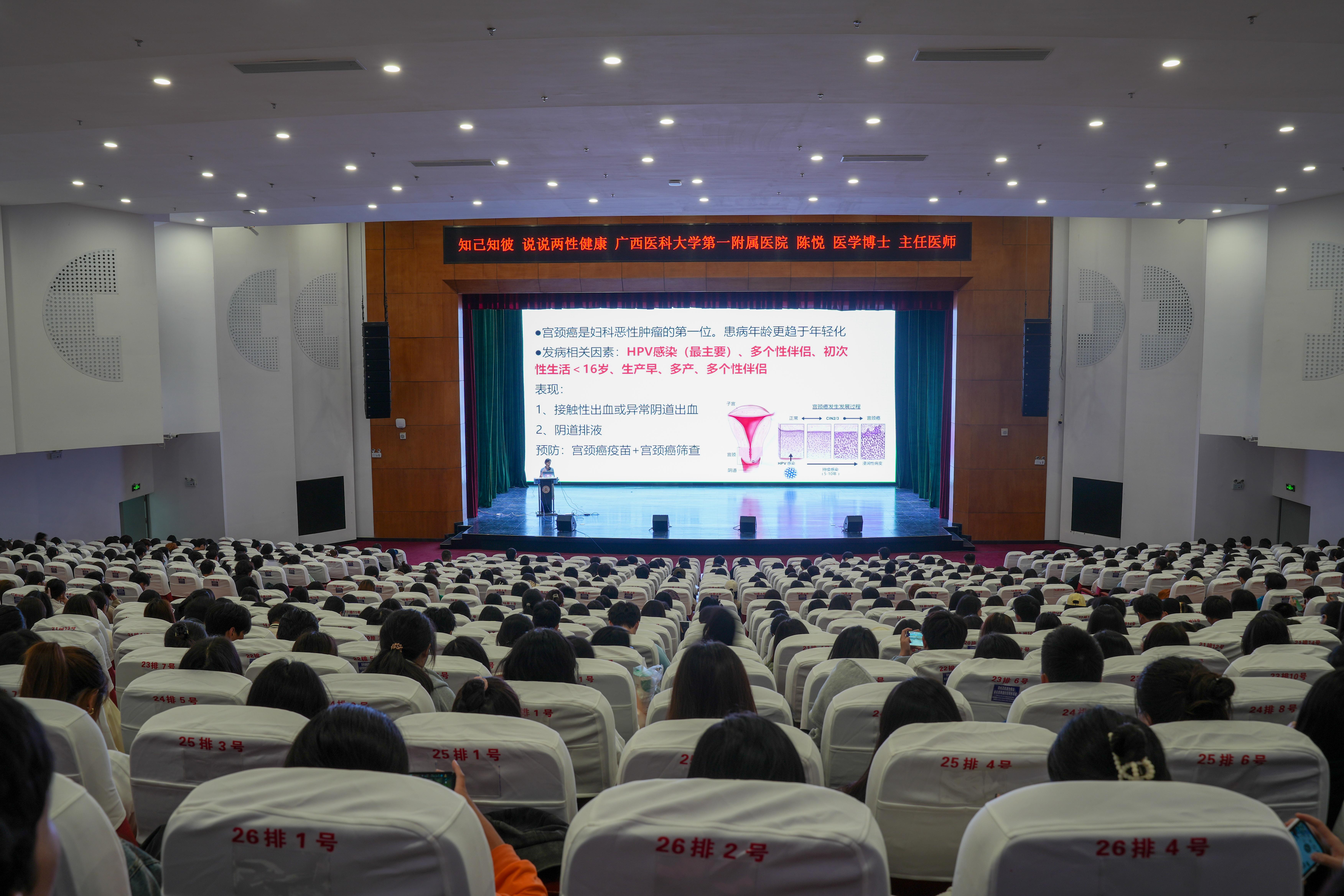 广西医科大学第一附属医院产科主任医师陈悦博士以“知己知彼 说说两性健康”为主题,引用发生在妇产科的案例深入浅出地讲授两性健康知识,从女性生理结构、两性健康、性安全教育、两癌预防等方面进行了精彩授课,教育引导女同学要保护好自己、关注自身健康、掌握必要的生育健康知识,具备提高辨别危险行为的能力。