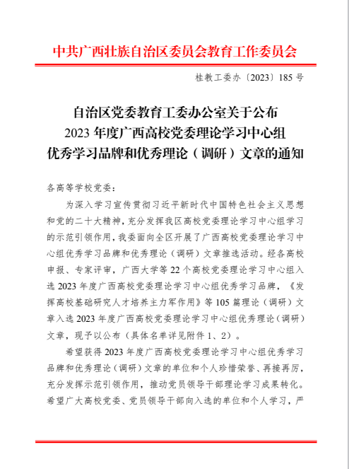 此次评选是自治区教育工委为深入学习宣传贯彻习近平新时代中国特色社会主义思想和党的二十大精神,充分发挥我区高校党委理论学习中心组学习的示范引领作用而面向全区开展了广西高校党委理论学习中心组优秀学习品牌和优秀理论(调研)文章推选活动。经各高校申报、专家评审,共有22个高校党委理论学习中心组入选 2023年度广西高校党委理论学习中心组优秀学习品牌,105篇理论(调研)文章入选2023年度广西高校党委理论学习中心组优秀理论(调研)文章。