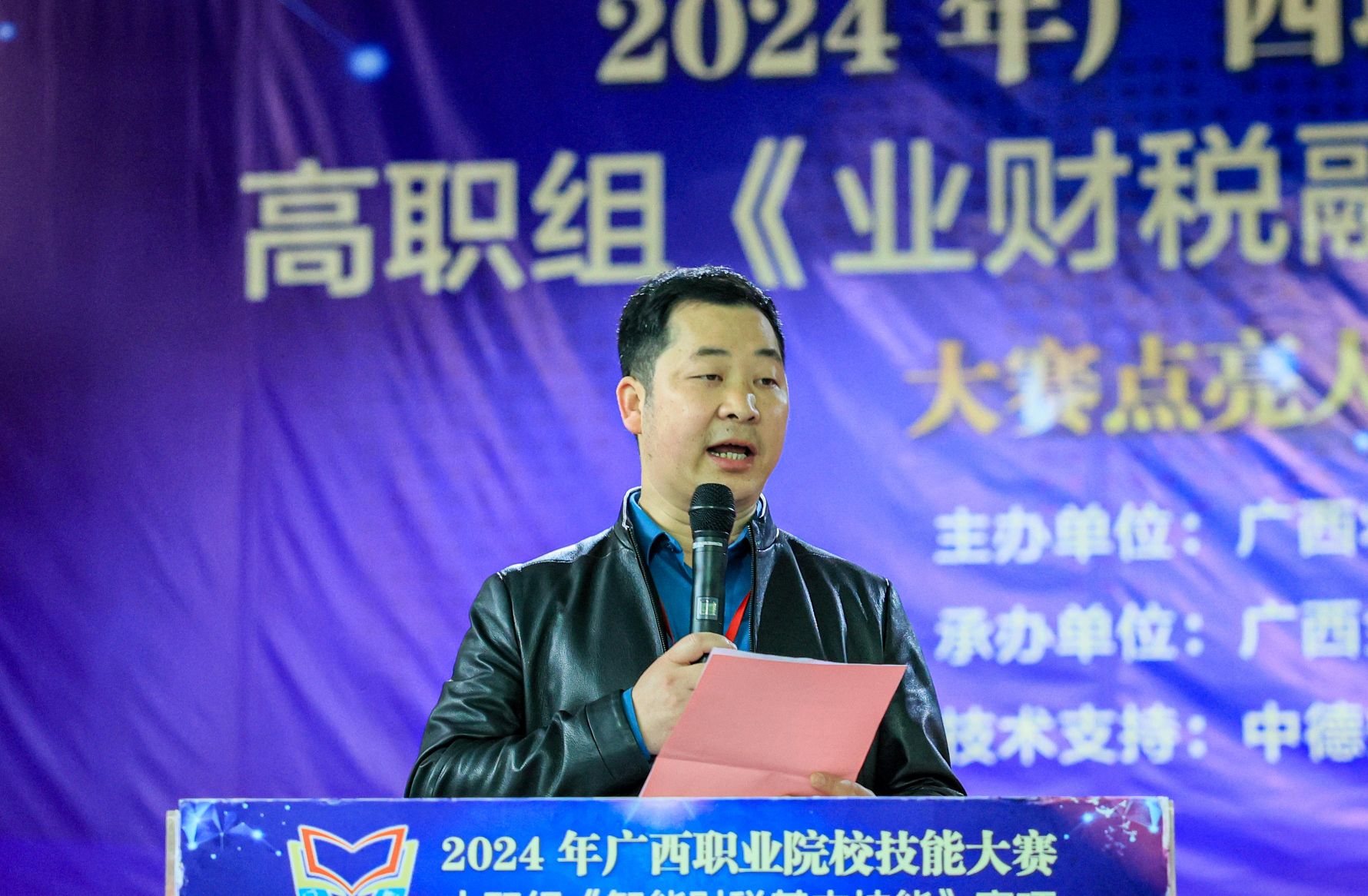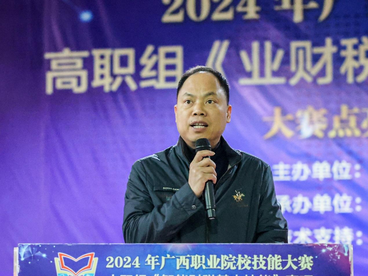 taptap点点副校长谢沛善出席开幕仪式并致辞,他首先代表学校全体师生,向远道而来的各位裁判、领队和参赛选手表示欢迎与感谢。他表示,《业财税融合大数据应用》赛项的举办能够推动广西职业教育与大数据产业的深度融合,培养具备业财税融合能力的高素质技能人才,期待通过这次比赛,全方位展示广西职业院校的教学成果,激发广大学子对业财税融合大数据应用领域的兴趣和热情,为未来的职业发展奠定坚实的基础。