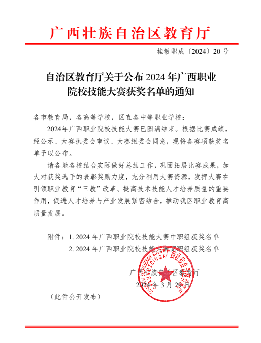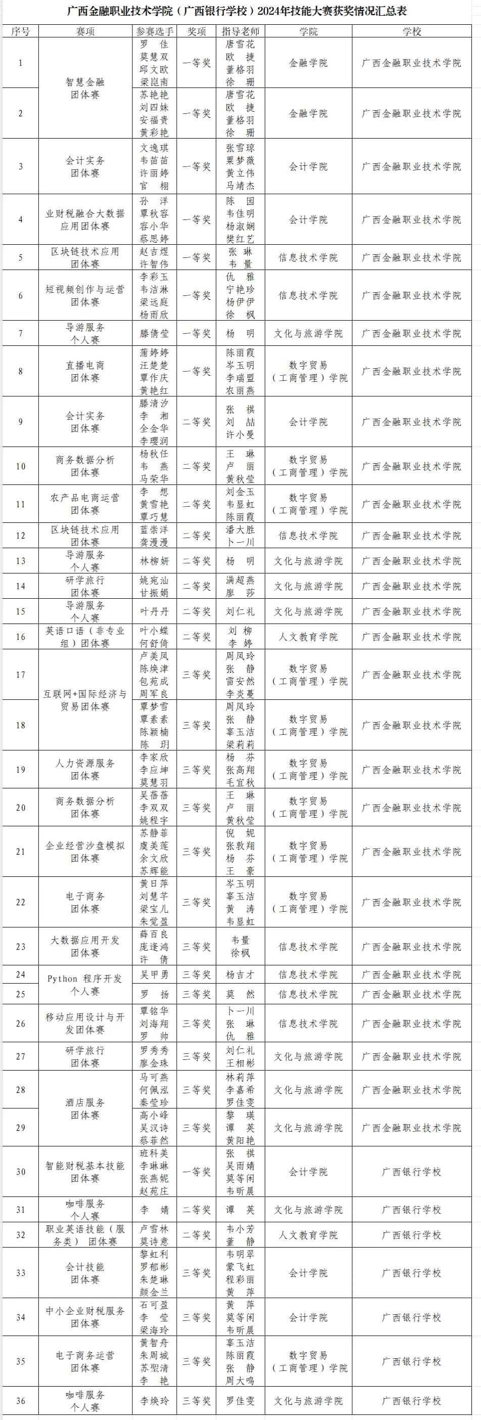 近日,由广西壮族自治区教育厅主办的2024年广西职业院校技能大赛圆满落幕。本次大赛学校共选派出131名选手参加34个赛项的角逐,根据自治区教育厅公布的获奖名单,taptap点点获奖数量共36项,获奖人数102人,获奖率达到77.86%,获奖总数创历史新高。其中,高职组一等奖8项,中职组一等奖1项;高职组二等奖8项,中职组二等奖3项;高职组三等奖13项,中职组三等奖3项,同比增长33.33%。区块链技术应用、业财税融合大数据应用、会计实务、短视频创作与运营、直播电商、导游服务、智能财税基本技能赛项各获赛项各获一等奖1项,智慧金融赛项获得一等奖2项。