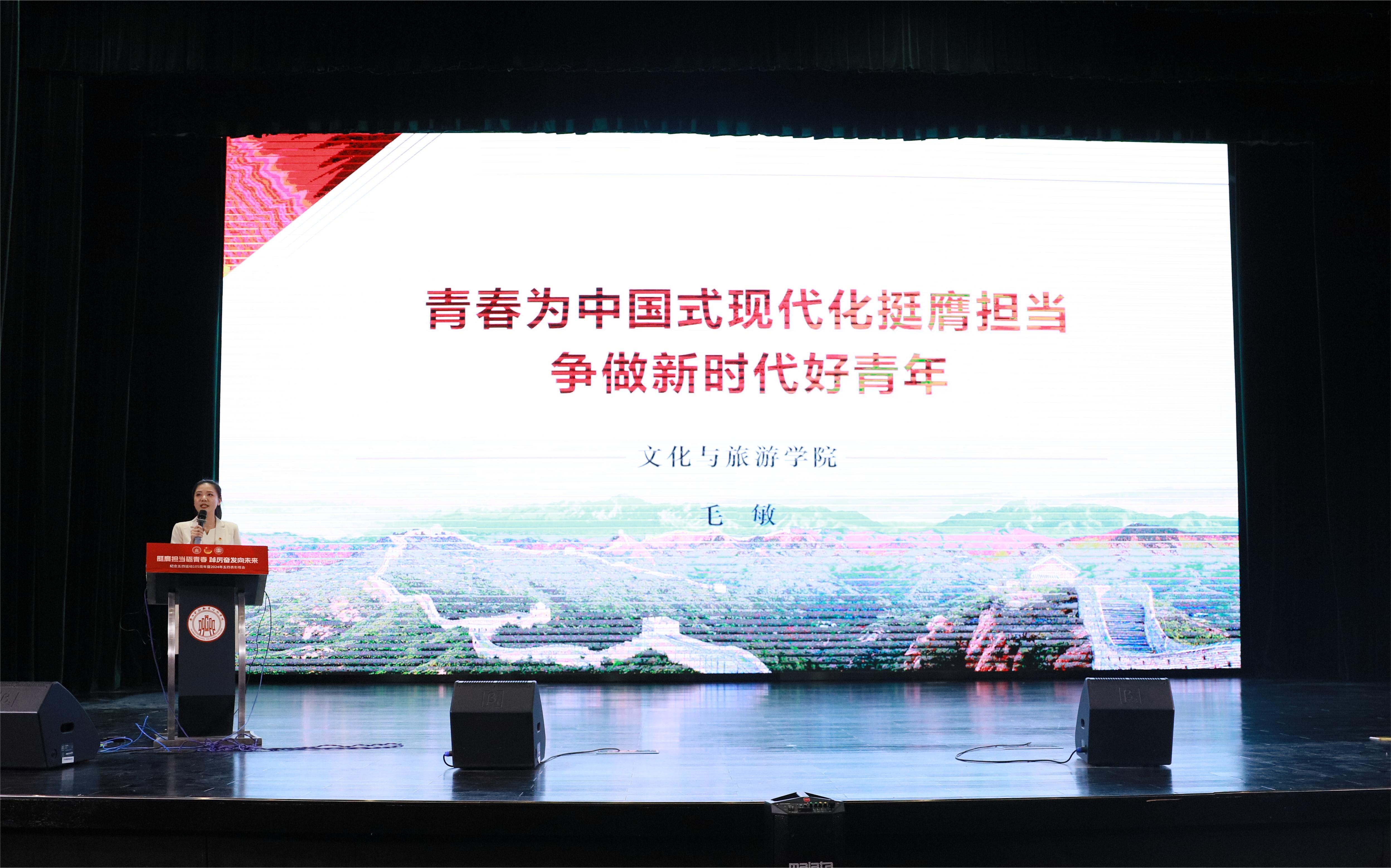 晚会在“五四主题团日活动——千人共上一堂团课”中拉开帷幕。文化与旅游学院分团委专干毛敏老师以《青春为中国式现代化挺膺担当-争做新时代好青年》为题,带领大家回顾了习近平总书记对青年殷切期望,再次学习了习近平总书记关于青年工作的重要思想,引导同学们认识到新时代是广大青年成就梦想的时代,号召同学们作为新时代好青年要努力为实现中华民族伟大复兴而接续奋斗。
