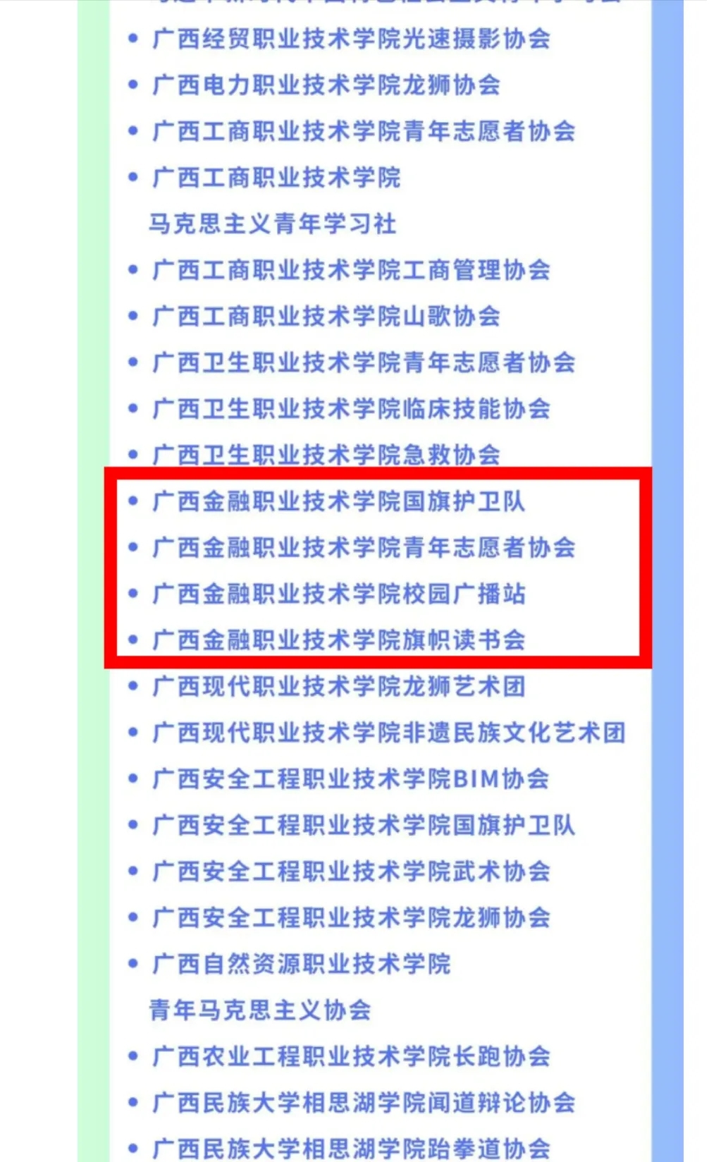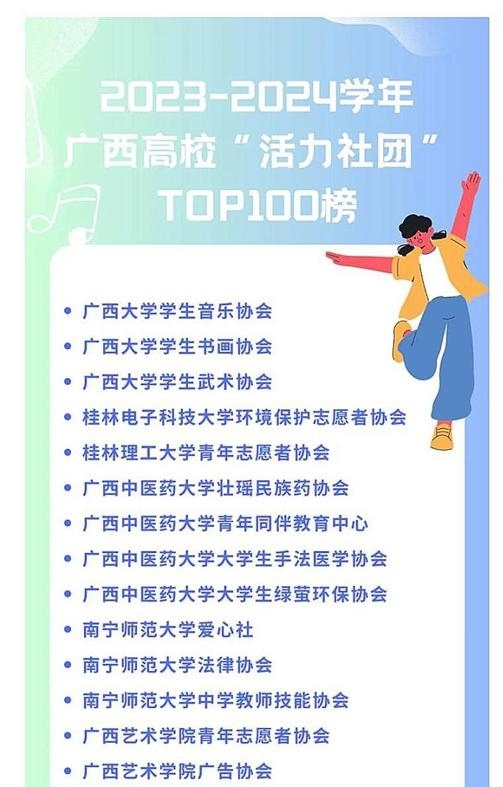 经学校推荐报送,taptap点点国旗护卫队、青年志愿者协会、校园广播站、旗帜读书会4个社团入选2023—2024学年广西高校“活力社团”TOP100榜。