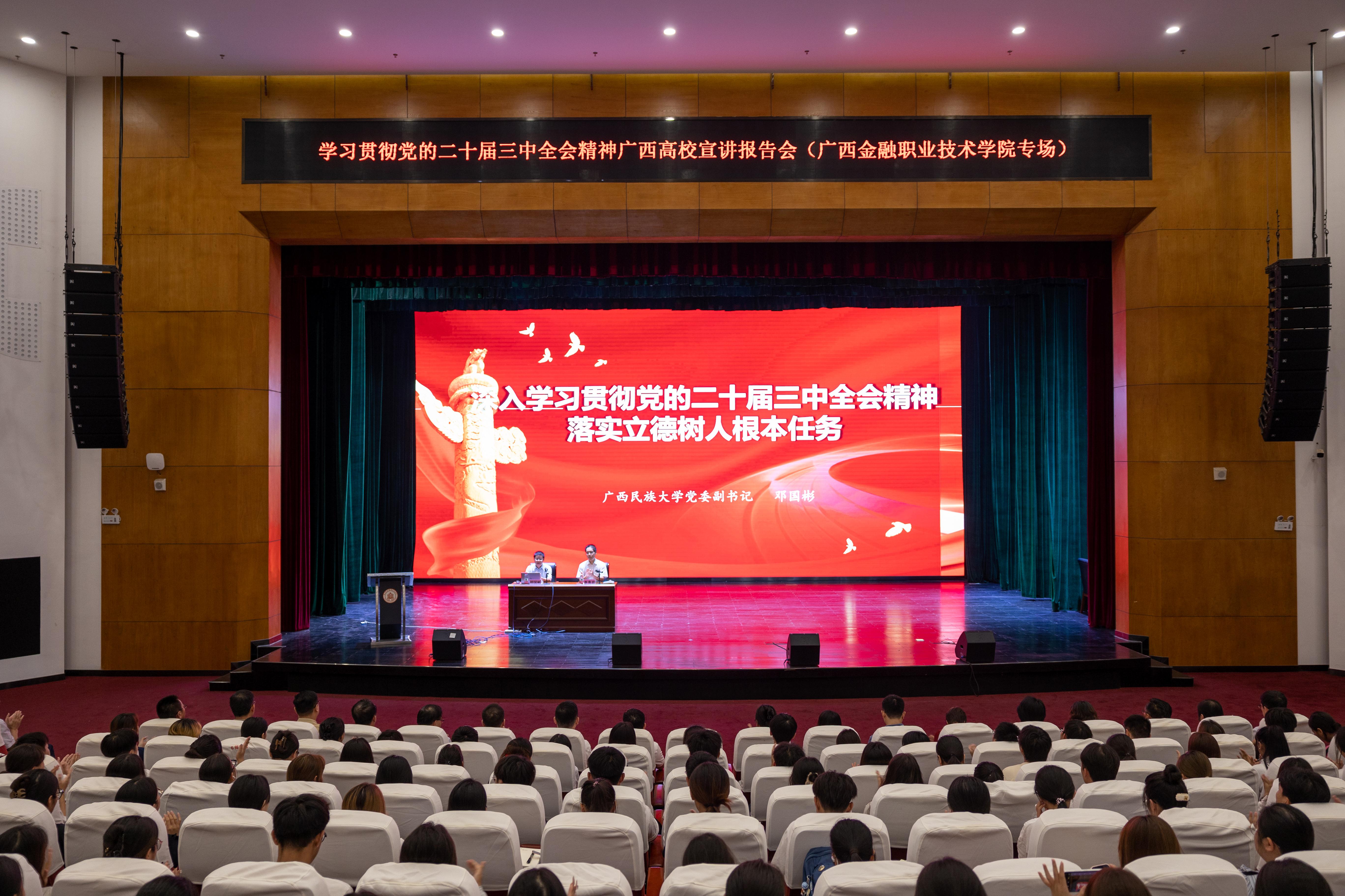 李高岩在主持报告会时指出,全校上下要以本次报告会为契机,提高站位、凝聚共识,把学习贯彻党的二十届三中全会精神作为当前和今后一个时期的重大政治任务;精心组织、多措并举,切实把思想和行动统一到党的二十届三中全会精神上来;担当作为、真抓实干,把学习贯彻党的二十届三中全会精神与加快推动学校高质量发展紧密结合。作为教育工作者,我们还要大力弘扬教育家精神,担负起立德树人的光荣使命,努力办好人民满意的职业教育,将全会精神转化为工作实绩,以更加坚定的信念、更加主动的担当,为党育人、为国育才,以改革精神推动学校高质量发展不断取得新成就,奋力谱写中国式现代化广西金职院实践新篇章。