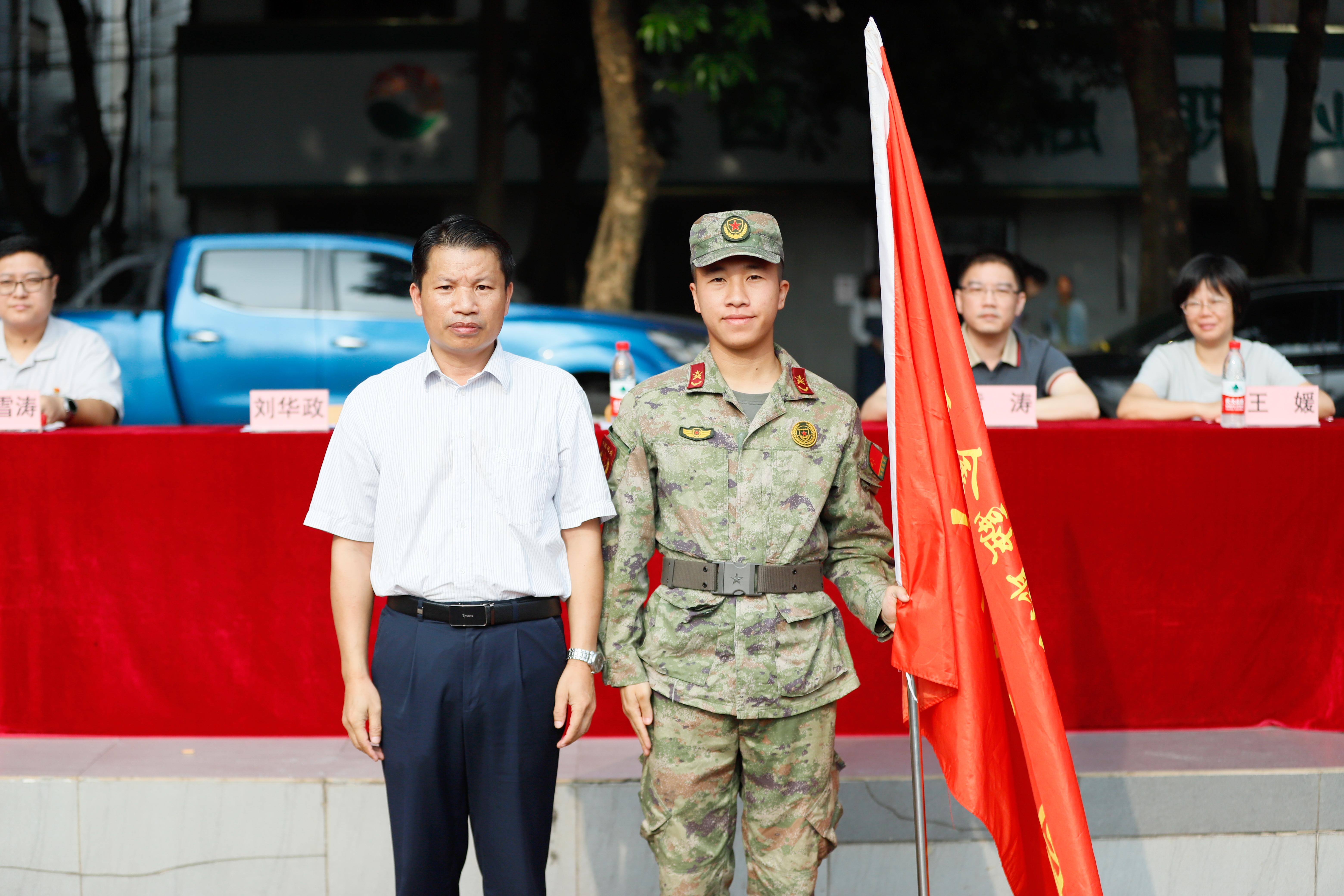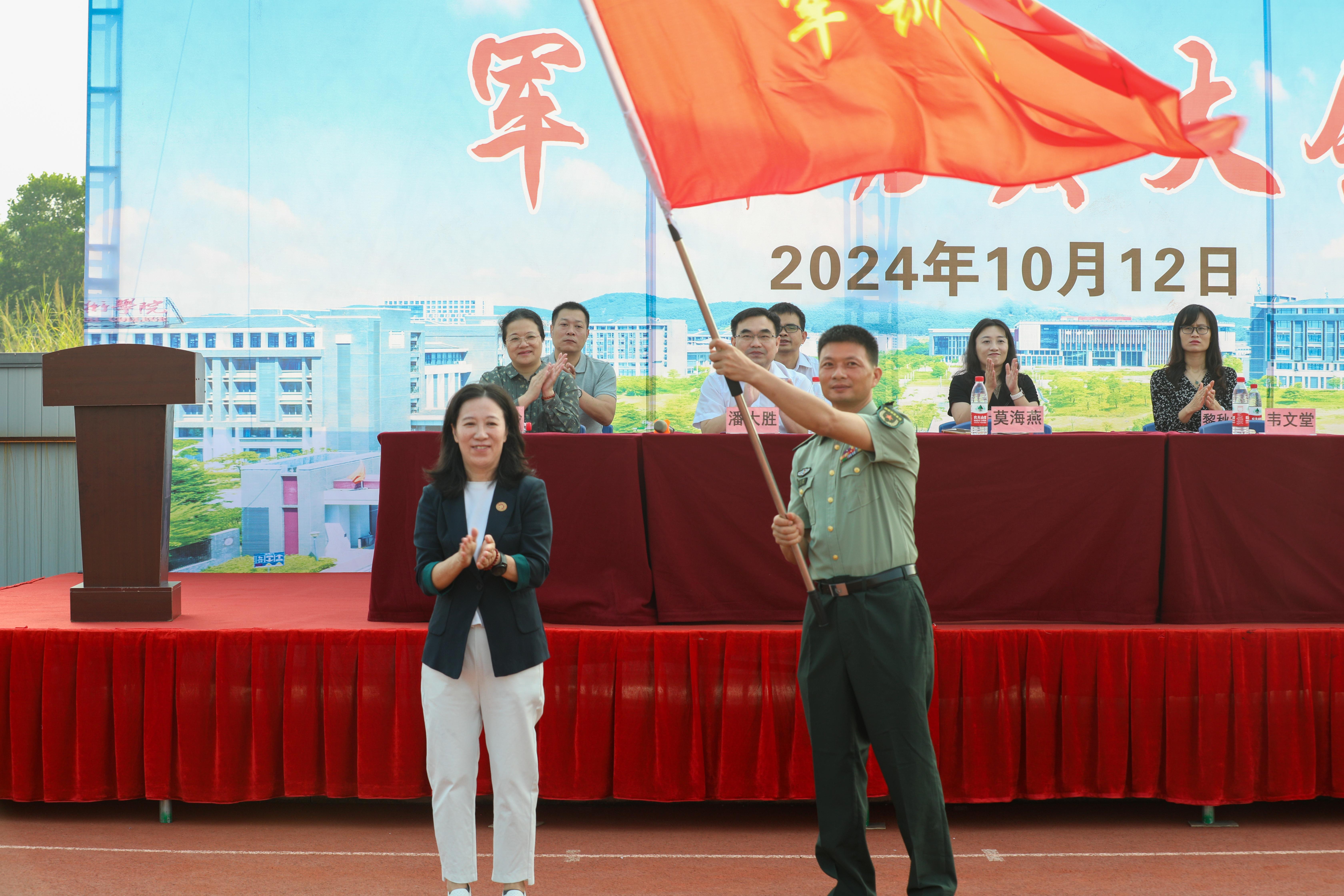 会上,莫海燕校长和刘华政副书记向承训单位授军训团团旗,鲜红的旗帜高高飞扬,标志着taptap点点2024级新生军训正式拉开帷幕。