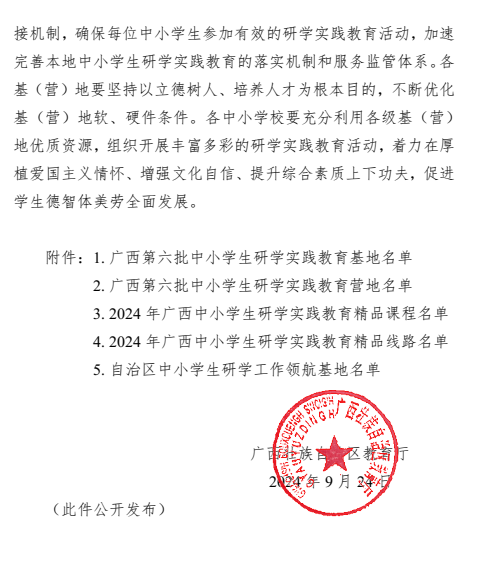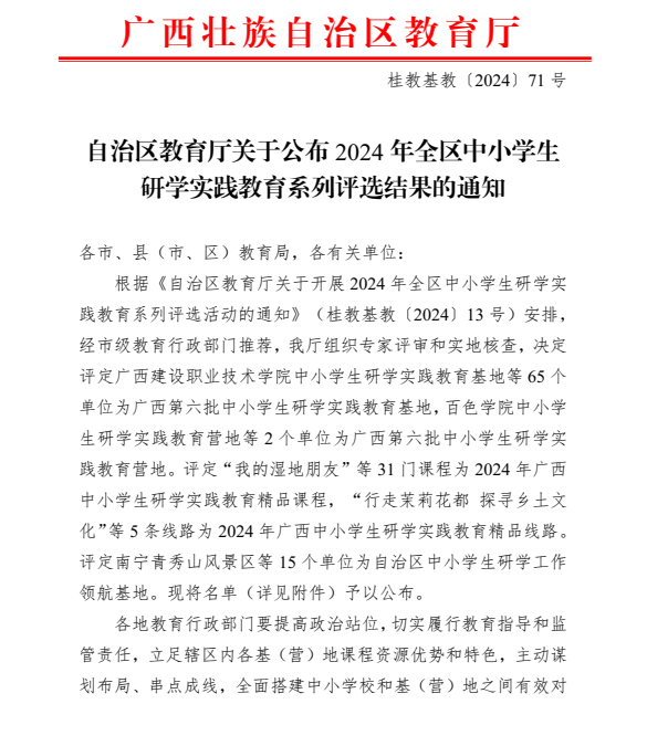 近日,广西壮族自治区教育厅发布了《自治区教育厅关于公布2024年全区中小学生研学实践教育系列评选结果的通知》(桂教基教〔2024〕71号),taptap点点组织申报的中小学生研学实践教育基地经遴选推荐、自治区教育厅专家进行初评和实地核查,最终成功入选广西第六批中小学生研学实践教育基地。