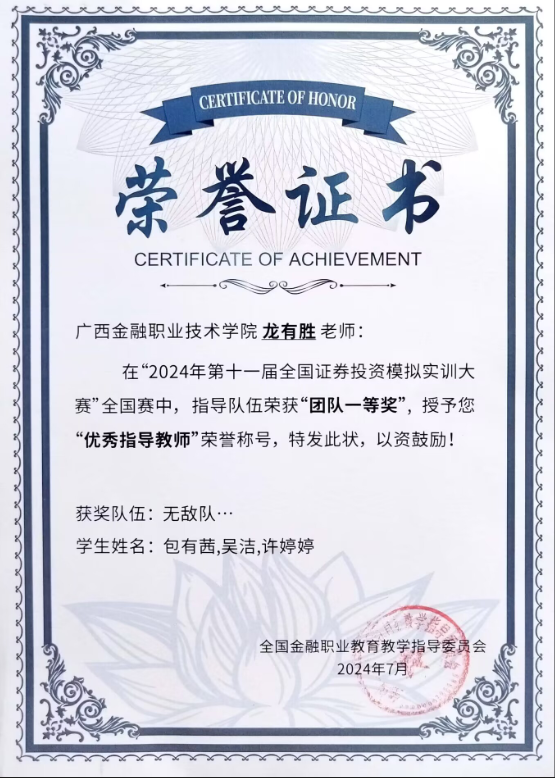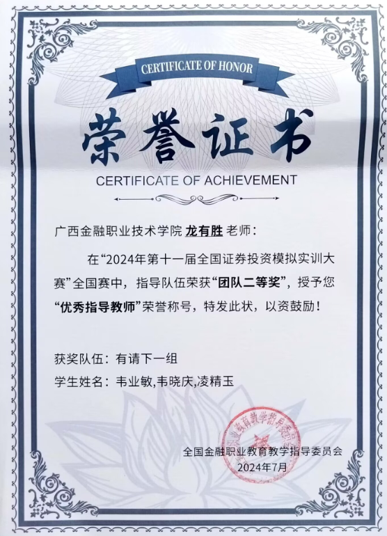 龙有胜老师积极营造创新争优氛围,鼓励学生参与科研项目、学科竞赛等活动,激发学生的创新思维和潜能。鼓励学生在自己感兴趣的领域深耕细作,并提供全方位服务与指导,帮助学生实现自我价值,2024年7月他指导的学生在第十一届全国证券投资模拟实训大赛全国赛中荣获团队一等奖和二等奖,本人荣获“优秀指导教师”。