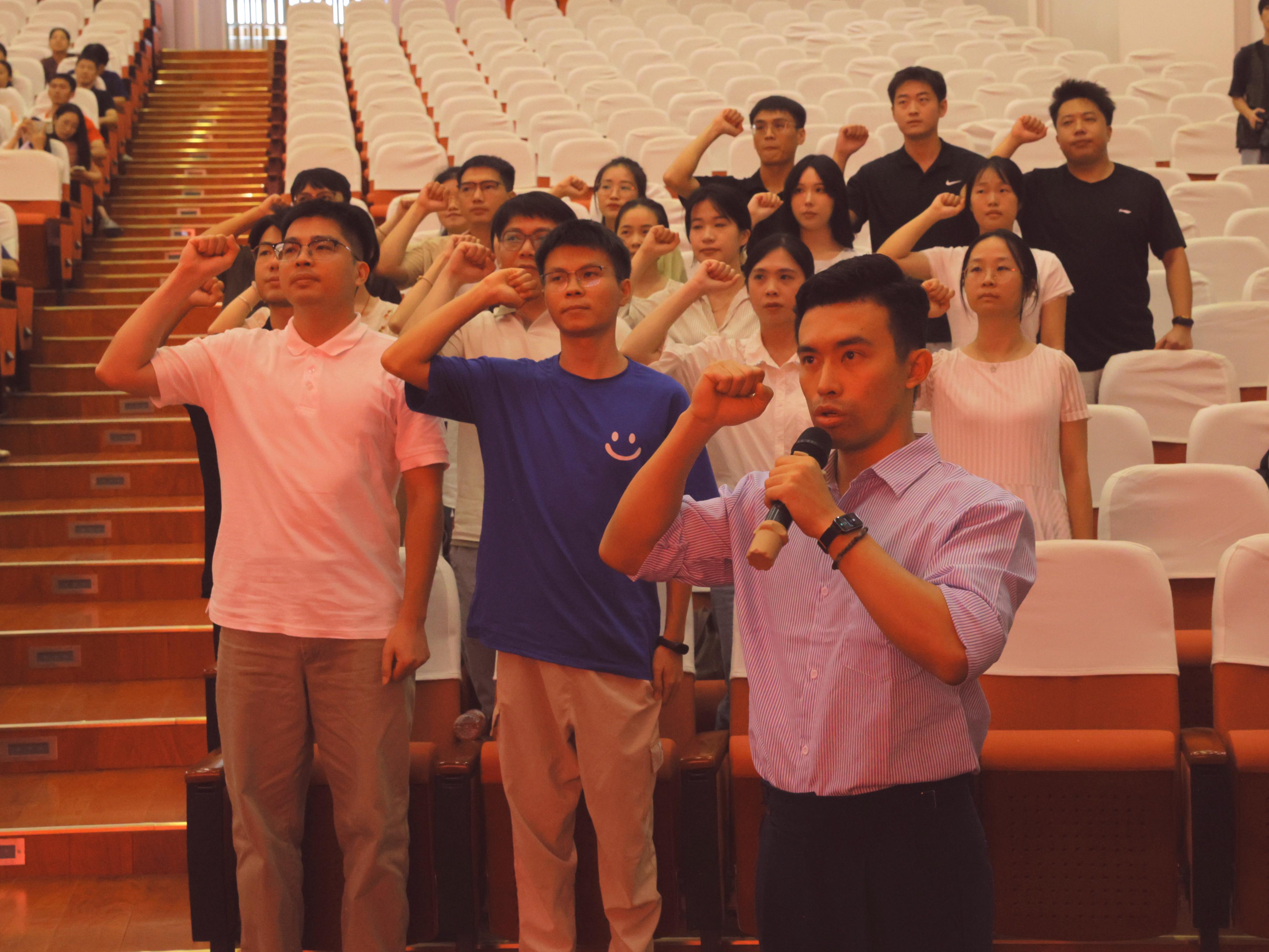 21名新入职的教师在数字贸易学院(工商管理学院)刘懿欢老师的带领下,进行新教师入职宣誓仪式。