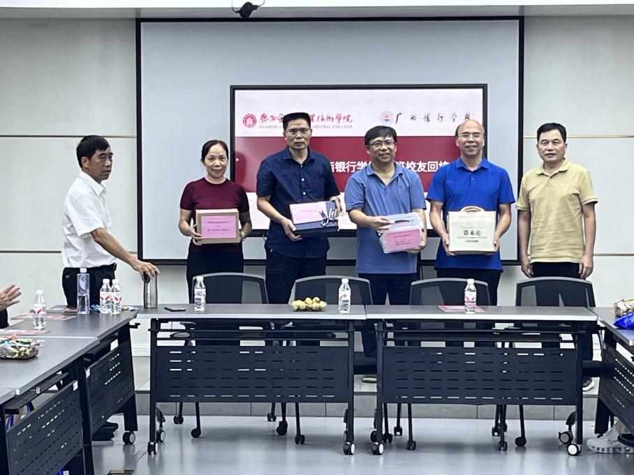 当天下午,在西校区412会议室召开校友座谈会,学校招生就业处(校友办)石利军处长代表学校致辞,对832班校友长期以来关注母校发展表示衷心感谢,并介绍了学院“双高计划”建设成果。校友代表韦立群动情回忆:“我们入学时学校只有一栋教学楼、一个专业,如今已是拥有万名师生的金融类高职院校,身为‘银行学校人’,我们骄傲!”座谈会上,832班向母校捐赠了上学时期使用的算盘、饭票以及1982年版《资本论》等一批珍贵实物,丰富校史馆藏品。石利军处长代表学校接受捐赠并回赠校友纪念徽章。