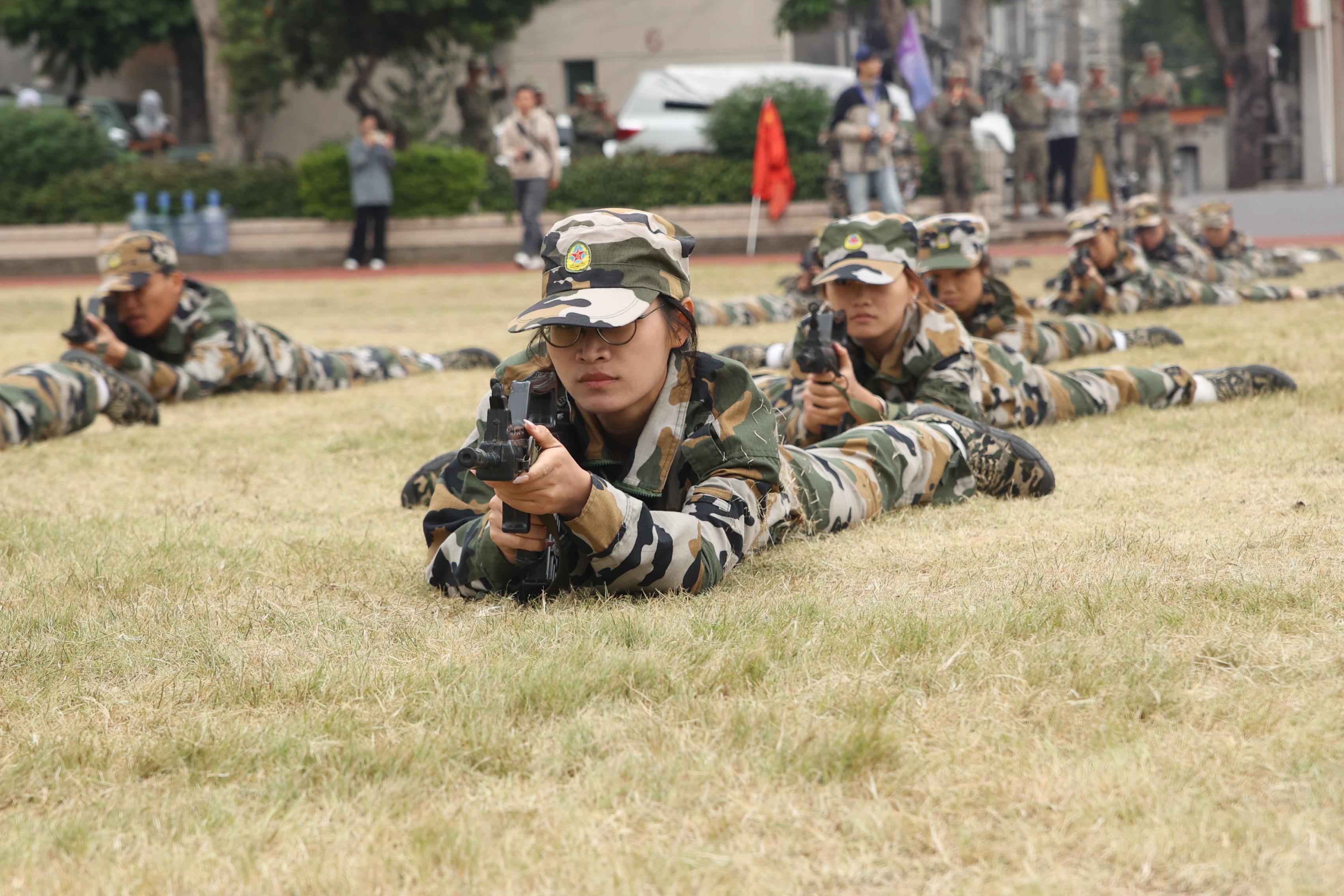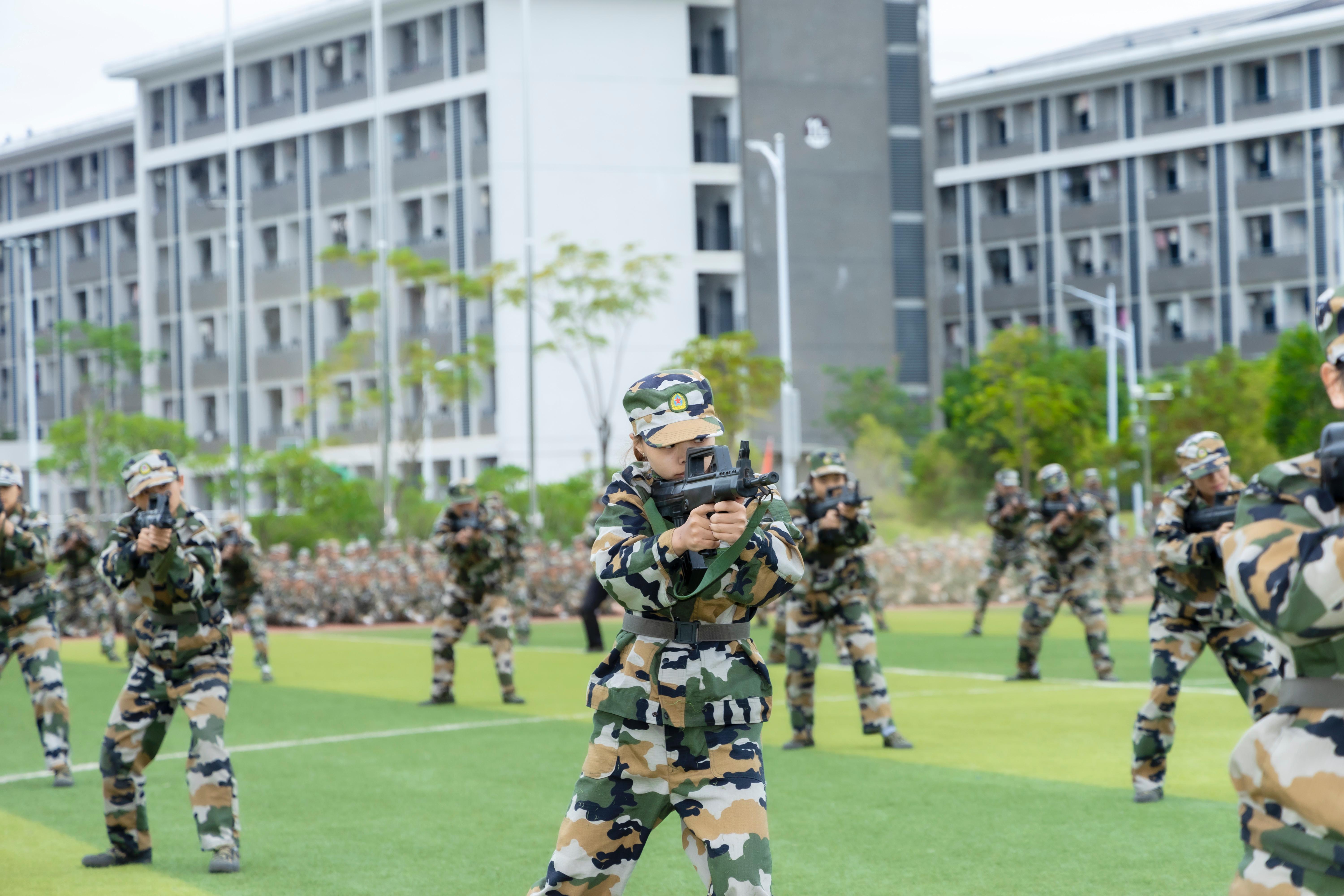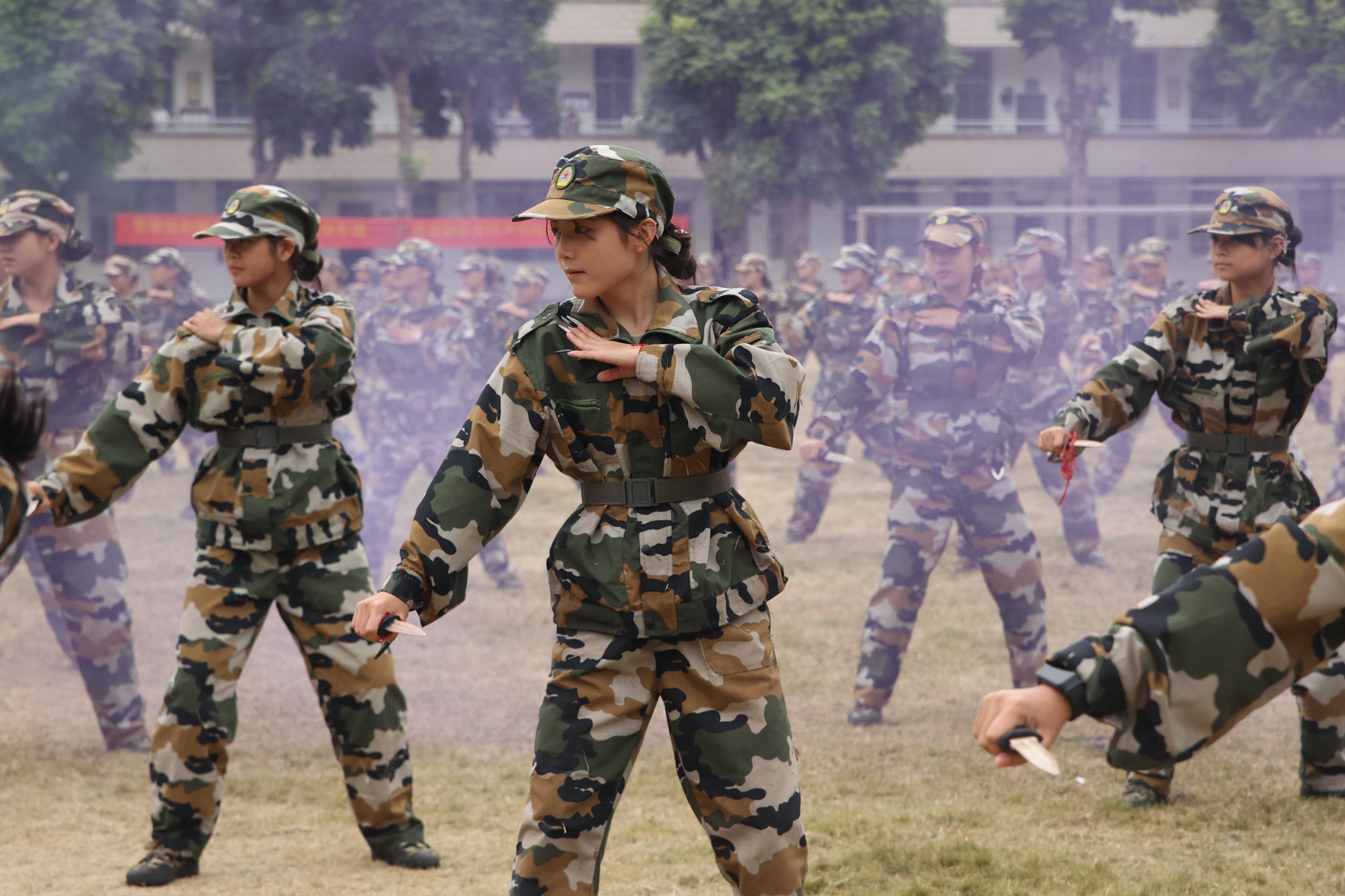 随后各方队依次展开军事技能汇报表演:分列式行进气势如虹,擒敌拳演练刚劲有力,刺杀操展示杀气凛凛,匕首操汇演灵动迅猛,捕俘拳演示招招制敌,警棍盾牌操表演协同默契,战术科目实景模拟更将现场气氛推向高潮。参训学生以坚韧的意志、凝聚力量的口号、彰显纪律意识的整齐队列,以及踏响拼搏节拍的铿锵步伐,全面展示了军训成果,更生动诠释了这场青春洗礼的深层意义——它让金院学子在汗水中淬炼了品格,在协作中凝聚了力量,在坚持中涵养了斗志,最终以饱满的热情与昂扬的姿态,为大学生活注入了永不褪色的奋斗底色。