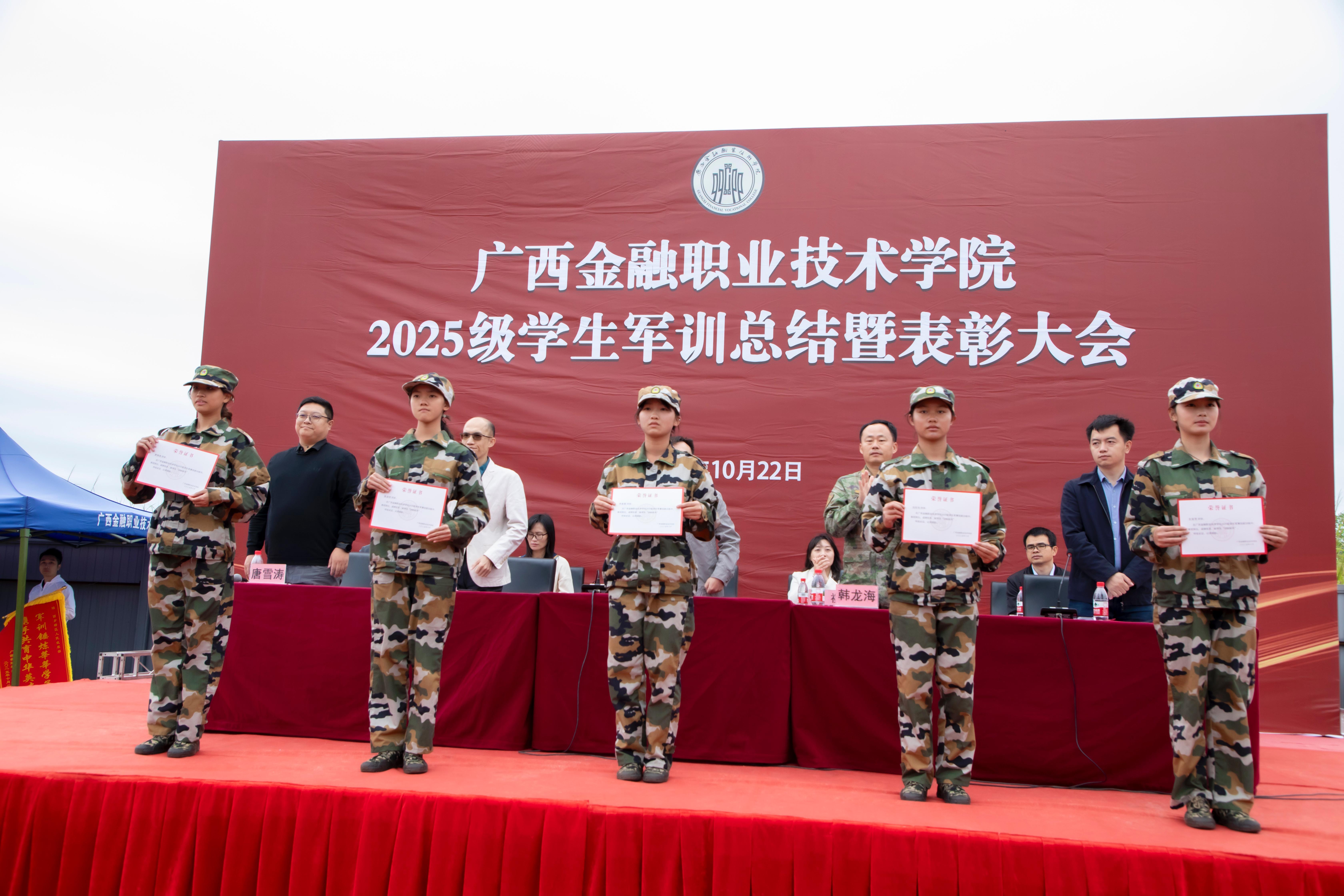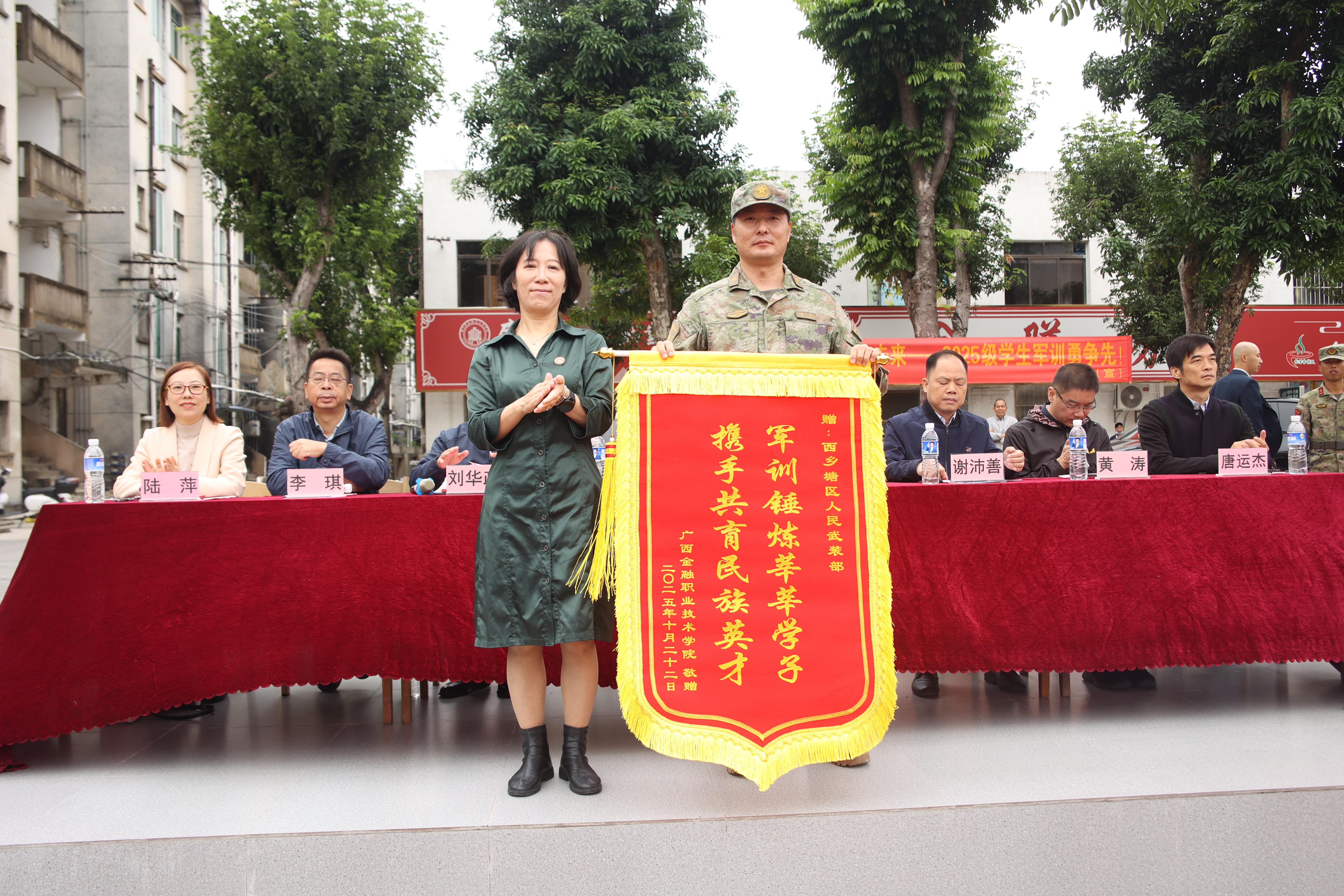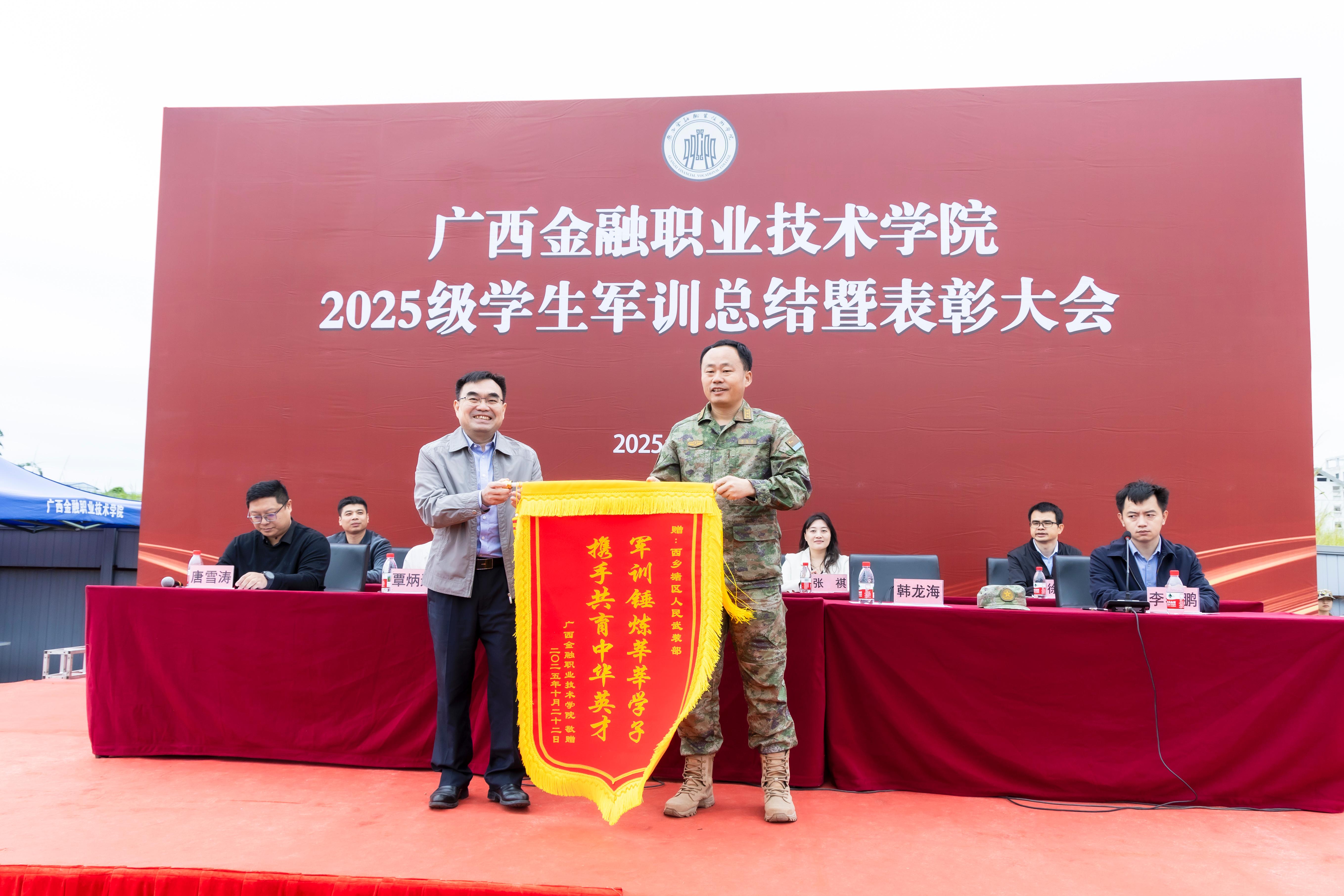 学校校长莫海燕、副校长潘大胜分别在东、西校区发表军训总结讲话。他们表示,同学们站出了“最挺拔的军姿”、走出了“最整齐的步伐”、喊出了“最嘹亮的口号”,让大家看到了中国青年应有的血性与担当!全体教官们把部队的作风带进了校园,把军人的品格种进了学生心里,用“严”要求,用“爱”守护,让训练场既有力度,更有温度,是最值得尊敬的人!他们寄语大家:一是让“坚持”成为青春的底色。把这份坚韧带进课堂、带进实训室,做那个“站得稳、定得住、靠得牢”的学习标兵。二是让“严谨”成为职业的信仰。把军训中的“豆腐块精神”延续到学习生活中,让严谨成为本能,让精准成为习惯,成长为值得托付的“金融卫士”!三是让“自律”书写人生的答卷。请记得站军姿时学会的克制,记住集体荣誉背后的付出,这些看似微小的选择,恰恰是塑造品格的最好课堂。愿同学们带着这份淬炼过的品格,在金职院这片沃土上,书写属于自己的、无愧于时代的精彩篇章!